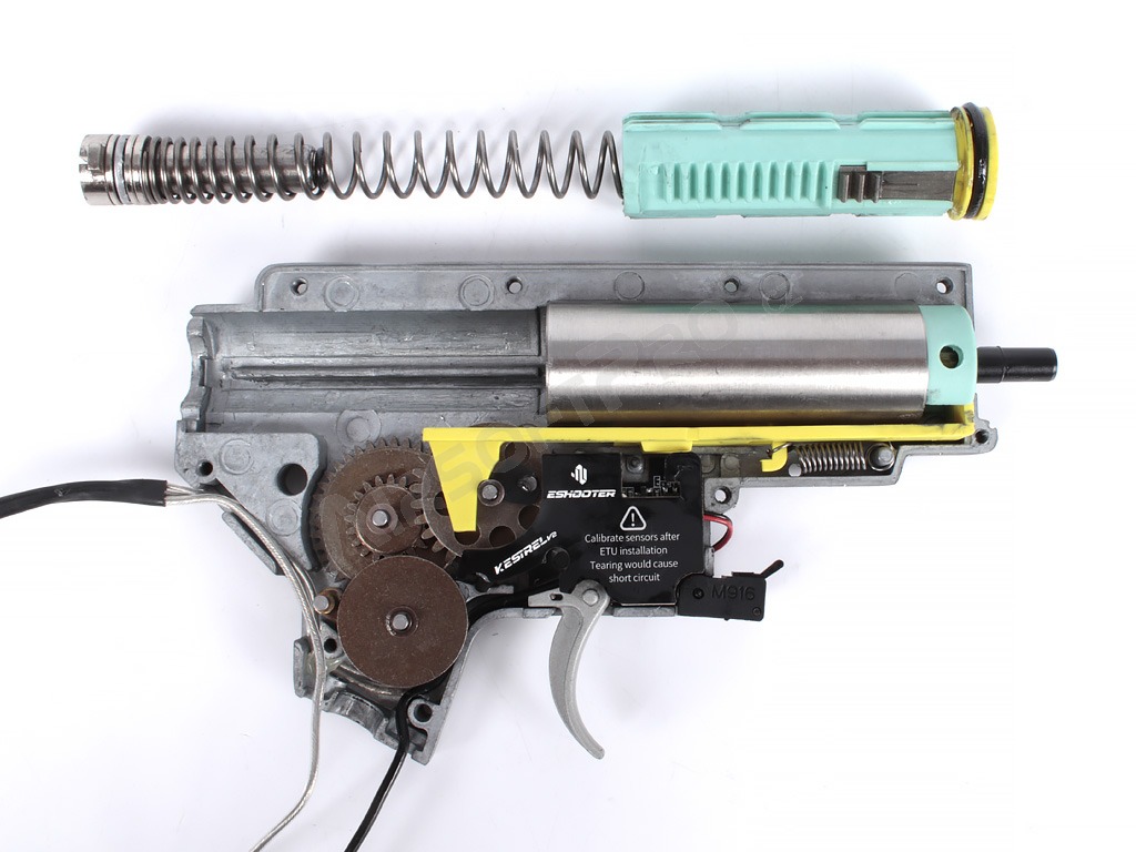 - MOSFET: směřuje energii z baterie přímo do motoru, a obchází mechanické spouštěcí kontakty. Výsledkem je vyšší kadence zbraně a rychlejší odezva spouště.