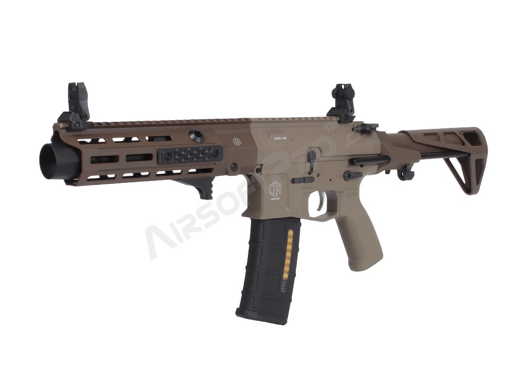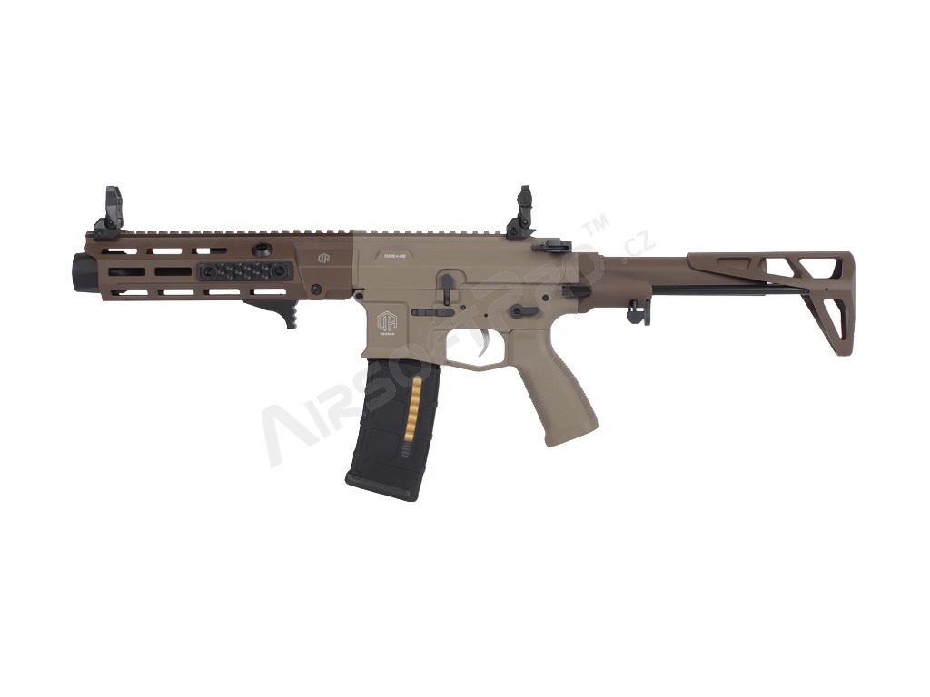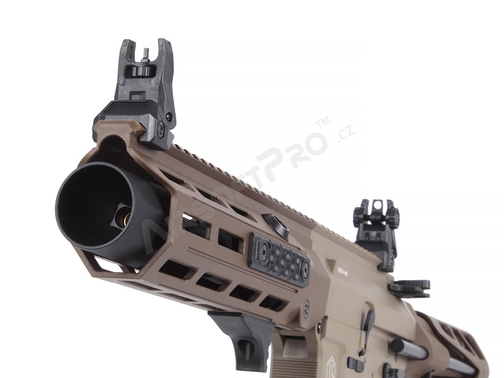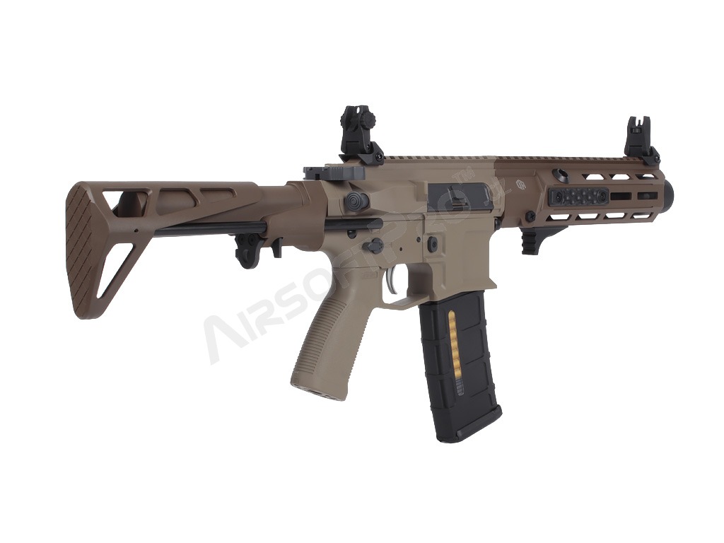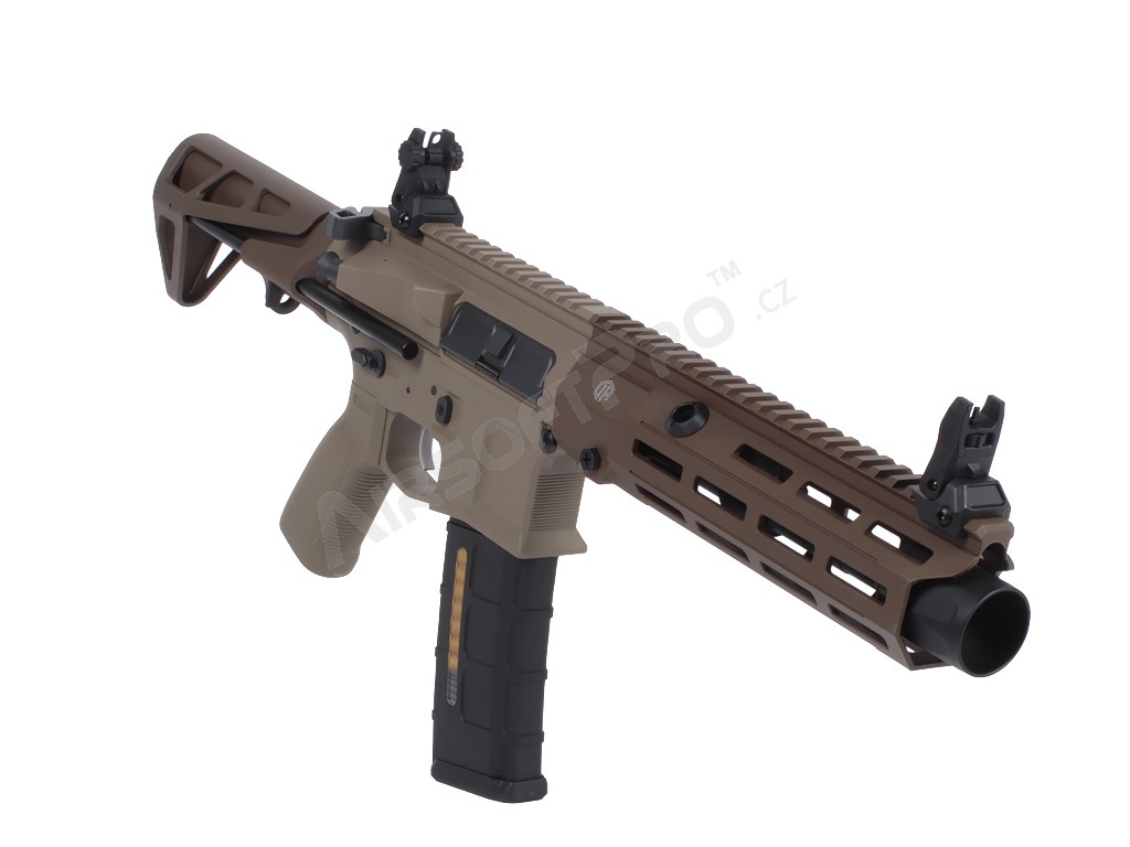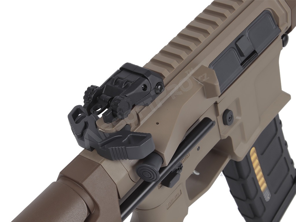 Tělo z lehkého polymeru se kovovými díly udržuje celkovou hmotnost příjemně nízko — pouze 2,26 kg — a přitom je dostatečně odolné pro bojové airsoftové nasazení. Odlehčená výsuvná pažba nastavuje délku v rozsahu 622–735 mm (4 polohy), sklápěcí mířidla umožňují snadné použití kolimátoru a M-LOK předpažbí dává prostor pro modulární montáže. Oboustranný přepínač střelby, moderní natahovací páka závěru a funkční bolt stop zajišťují komfortní manipulaci. Hliníkový účinný zesilovač zvuku přidává silný akustický efekt při výstřelu.