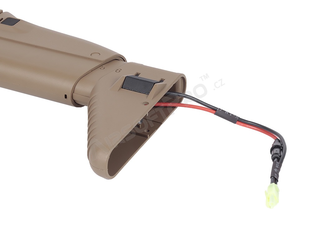 Akumulátor se připojuje přes klasický konektor Mini Tamiya a ukládá se přímo do pažby. Velkou výhodou je plná kompatibilita s rozšířenými zásobníky typu M4.