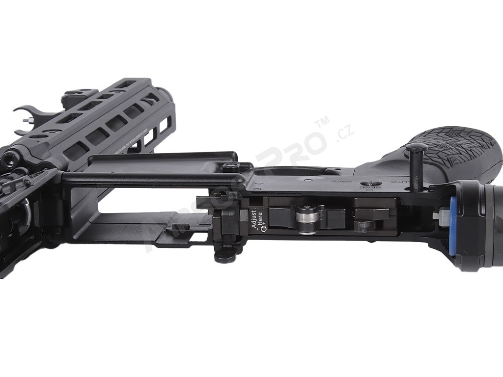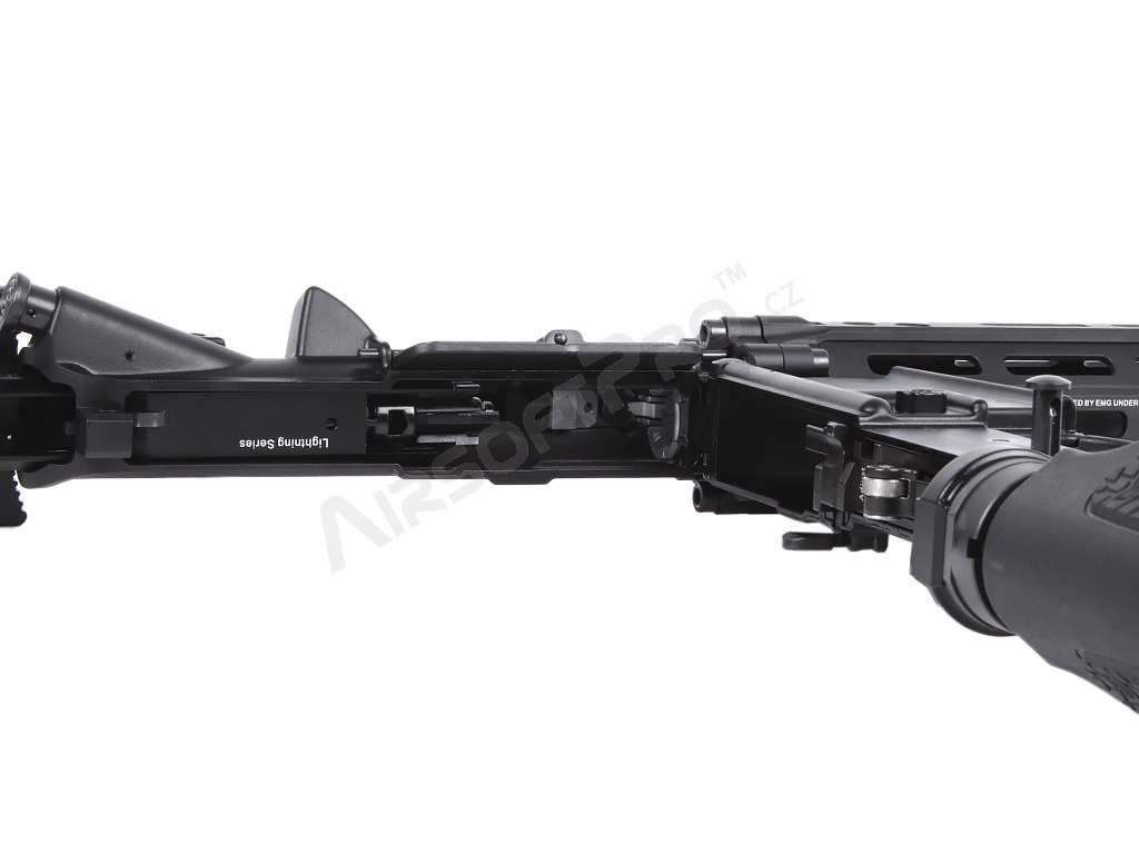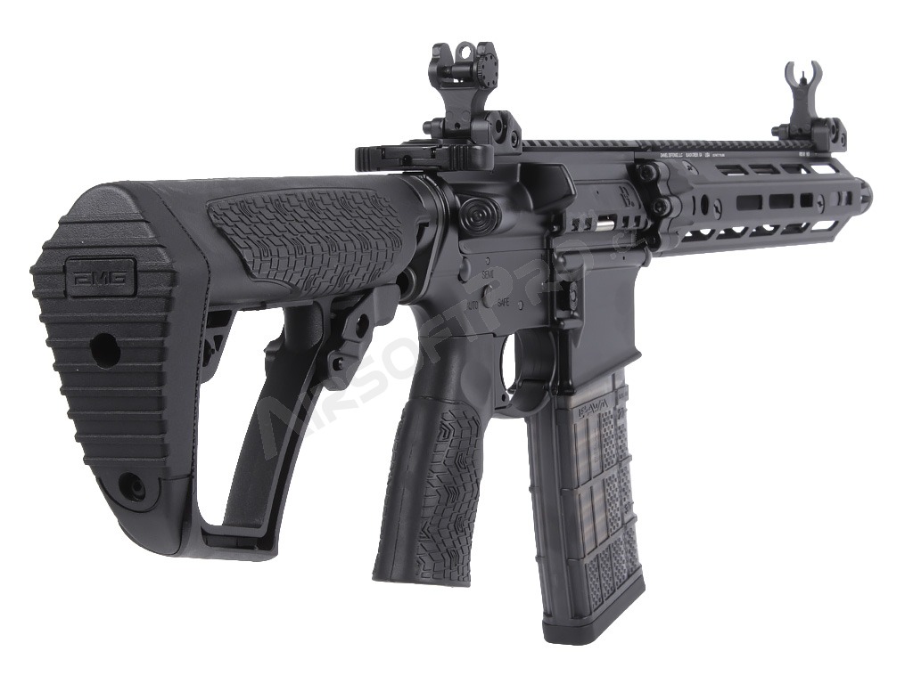 Kompaktní 9,5" vnější hlaveň činí z této pušky ideální nástroj pro CQB i boj na střední vzdálenosti. Zbraň je osazena nastavitelnou pažbou EMG "ETA" a ergonomickou pažbičkou. Autentičnost doplňuje licencovaný tlačný zásobník Lancer Systems L5 AWM na 30 ran s realistickým značením.