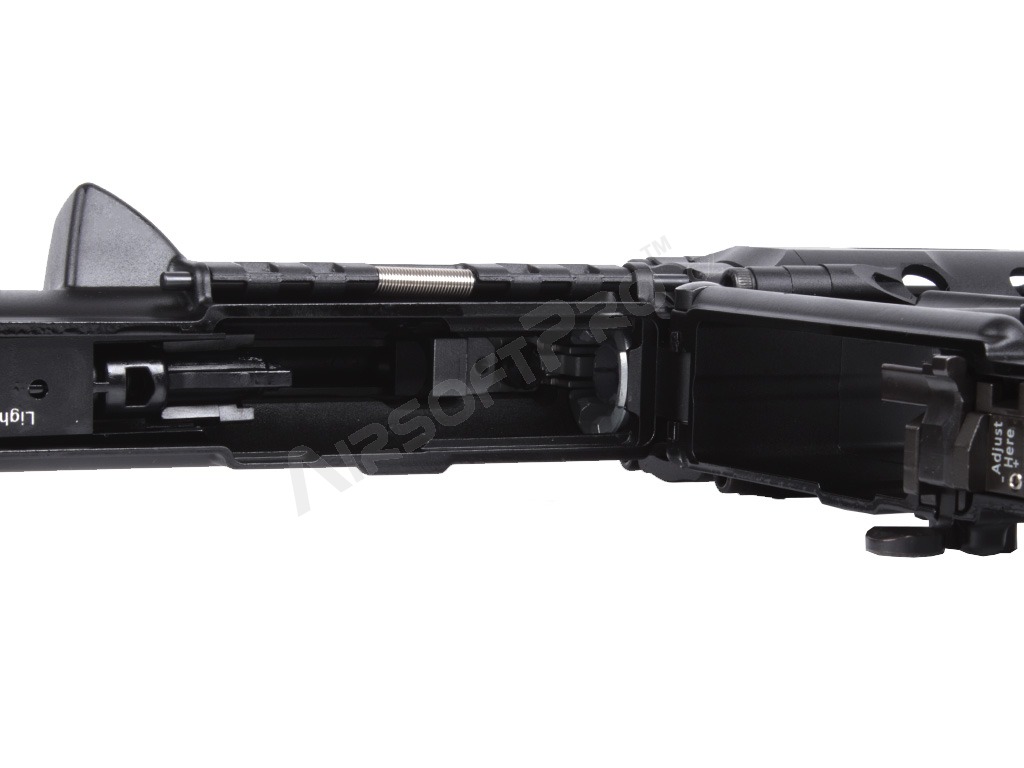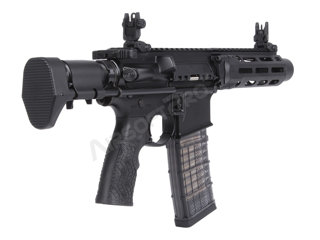 Kompaktní 7" vnější hlaveň činí z této pušky ideální nástroj pro CQB. Zbraň je osazena kovovou vysouvací pažbou. Autentičnost doplňuje licencovaný tlačný zásobník Lancer Systems L5 AWM na 30 ran s realistickým značením.