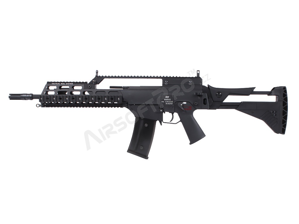 WE G39 RAS IDZ (GBB) je vysoce realistická plynová blowback replika v měřítku 1:1 od taiwanské značky WE. Robustní tělo z odolného ABS plastu kombinuje nízkou hmotnost (3,9 kg) s mechanickou odolností, zatímco klíčové vnitřní komponenty – závěr, spoušťový mechanismus a další pohyblivé části – jsou kovové, což zaručuje přesný chod a dlouhou životnost. Označení „RAS“ značí verzi s taktickým kovovým předpažbím (Tactical Rail System) vybaveným RIS lištami ze všech čtyř stran, která rozšiřuje možnosti osazení příslušenství. Tato verze je konstrukčně blízká verzi K (karabina), liší se však použitím CNC kovového předpažbí místo plastového.