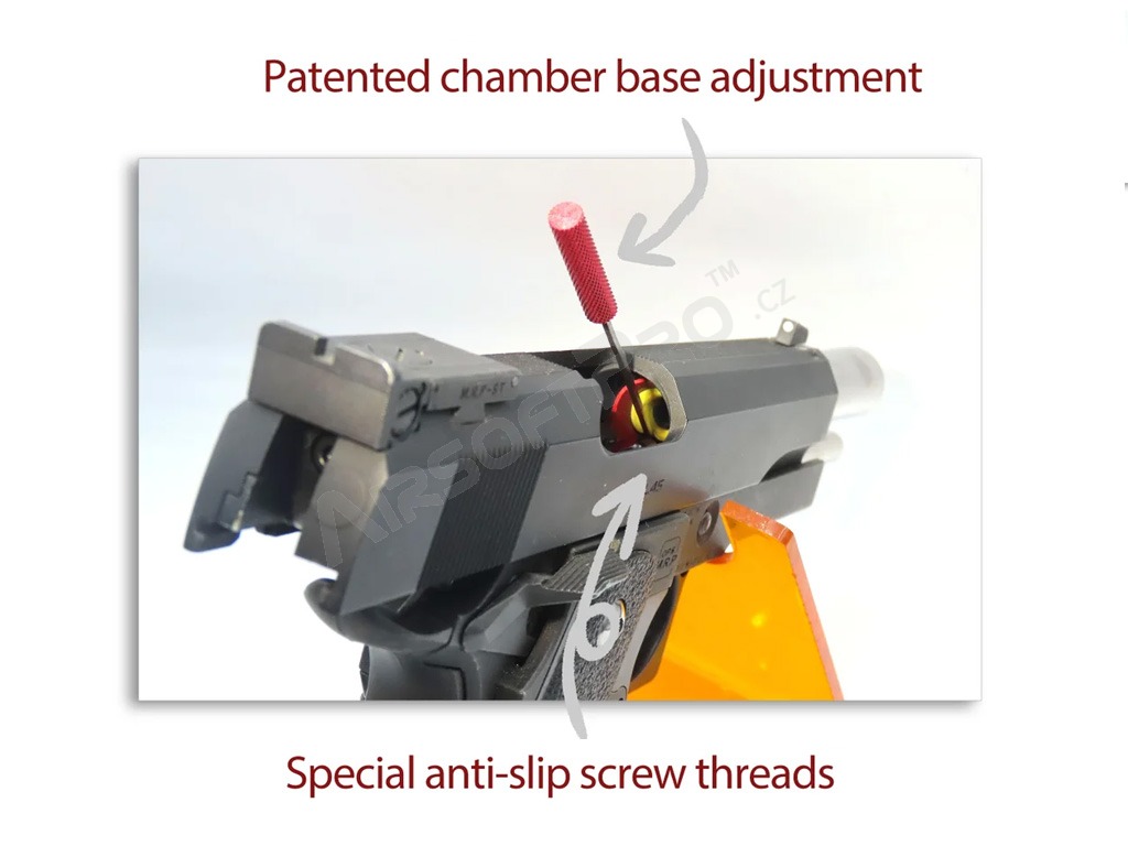 Na rozdíl od tradičního způsobu je možné nastavovat hop-up přímo přes spodní část komory (pomocí imbusového klíče 1,5 mm), aniž by se musel sundávat závěr pistole, což výrazně zvyšuje pohodlí a efektivitu. Přítlak je řešený systémem TDC - široký přítlačný váleček tlačí kolmo na gumičku, a zajistí tak lepší přítlak na celé ploše Hop-Up gumičky.