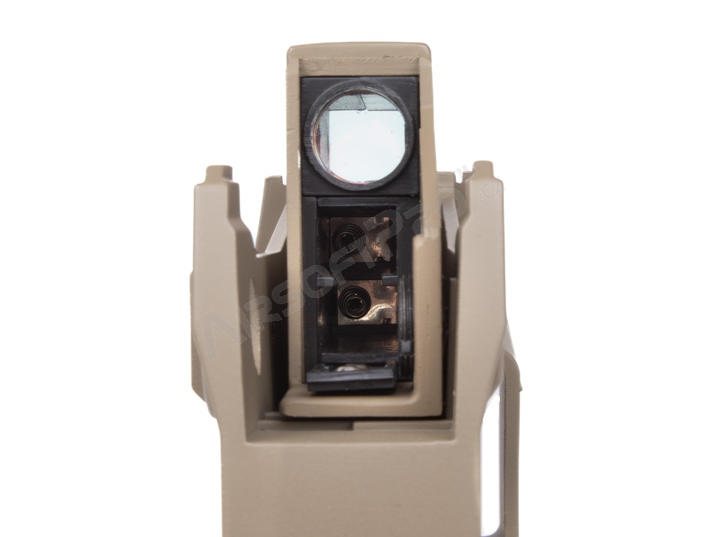Vestavěný kolimátor s červenou tečkou umožňuje rychlé a přesné zamíření. Díky dvěma úrovním jasu si snadno přizpůsobíte intenzitu bodu podle světelných podmínek. Kolimátor je plně seřiditelný stranově i výškově, takže ho lze přesně doladit na vaši repliku. Napájení zajišťují dvě běžné AAA baterie (nejsou součástí balení). Lehká a odolná kovová konstrukce zajišťuje dlouhou životnost a autentický vzhled.
