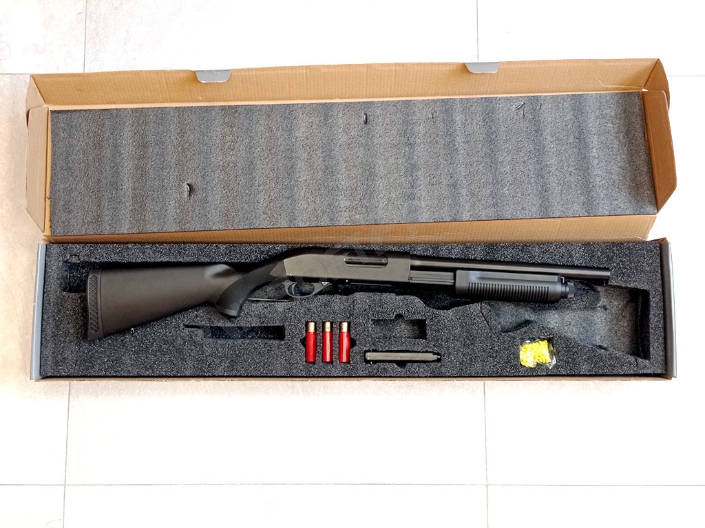 Airsoftová replika manuální brokovnice v měřítku 1:1. Tělo včetně hlavní je kovové s matnou povrchovou úpravou. Pažba a nabíjecí předpažbí je z odolného ABS plastu. Zbraň je vybavena oky na zavěšení popruhu. Tato brokovnice používá místo klasického zásobníku imitace patron. Kuličky se pomocí rychloplničky naplní do patrony a ta se poté vloží do zbraně. Kapacita patrony je 30 kuliček. Brokovnice pracuje na manuálním principu, kdy se musí před každým výstřelem natáhnout reálným pohybem předpažbí. Brokovnice na jedno natáhnutí vystřelí tři kuličky. Zbraň má rovněž funkční pojistku.