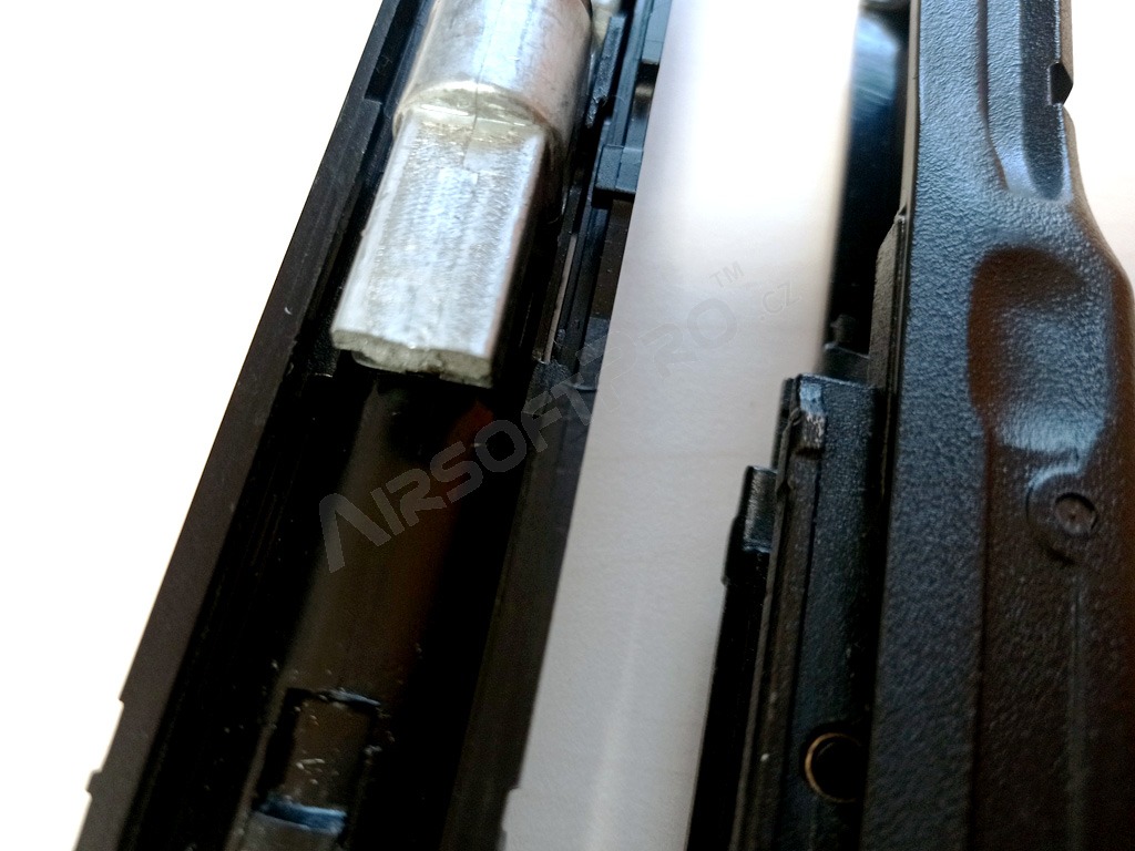Tento model je zajímavý tím, že po poslední vystřelené kuličce a při následujícím natažení závěru, zůstane závěr zaseknutý v zadní poloze. Závěr vrátíte do původní polohy stiskem páčky na levé straně zbraně. Stejně jako u podstatně dražších plynových zbraní při vystřelení poslední rány ze zásobníku. Musíte tedy vyjmout zásobník a doplnit kuličky.