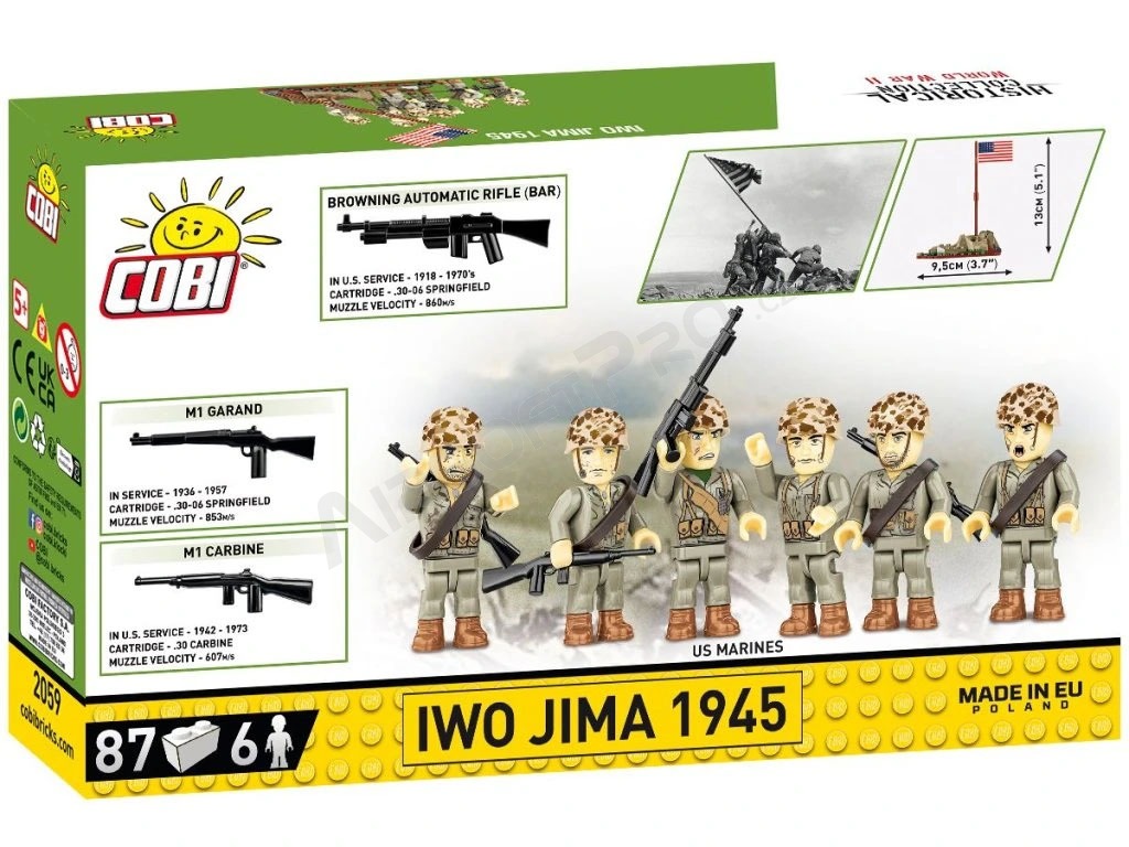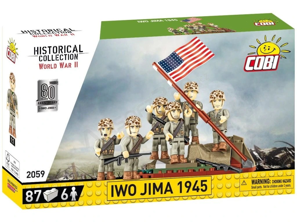 Sada obsahuje model skalnatého vrcholu hory Suribači, tištěnou, realistickou americkou vlajku na dlouhém stožáru, 6 figurek amerických vojáků v uniformách s různými výrazy a drženími těl, všechny detaily jsou potištěny přímo na kostkách, bez použití samolepek a dekorativní štítek s nápisem „Iwo Jima 1945“ pro vystavení na poličce.