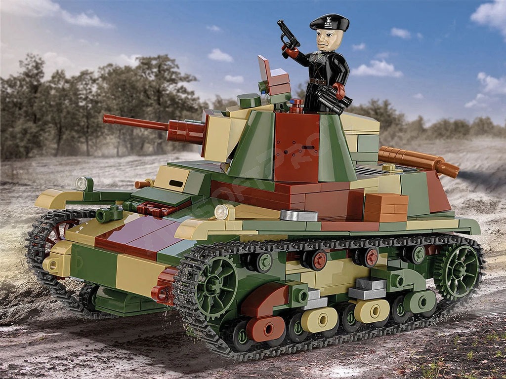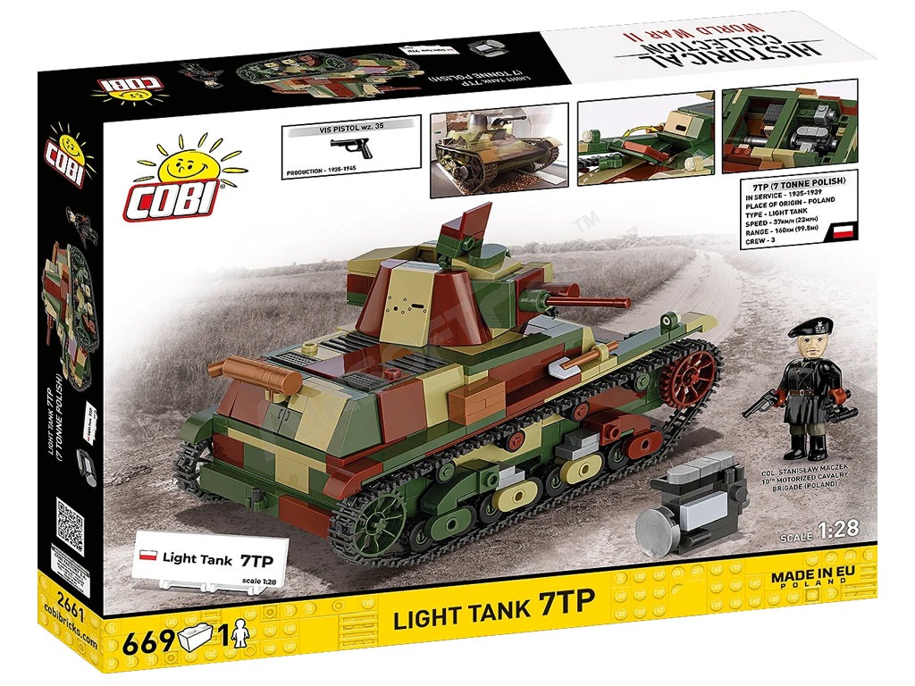 Postavte si z kostek stavebnice vlastní model tanku 7TP. Lehký tank 7TP byl nejcennějším obrněným vozidlem polské armády během zářijového tažení roku 1939. Byl vyjádřením ambicí mladé země, která vytvořila moderní design založený na britském tanku Vickers. Vozidlo bylo vybaveno vznětovým motorem, otočným periskopem Gundlach, který poskytoval osádce lepší výhled, 37mm kanónem Bofors Mk. 37 a 7,92mm kulometem Mk. 30. To umožňovalo tanku 7TP efektivně bojovat jak s německými Panzery I, tak s pokročilejšími Panzery II. Co se týče pancéřování, byl 7TP druhý hned po novějších německých středních tancích: PzKpfw III E a PzKpfw IV B-C. Stojí však za zmínku, že tato vozidla byla výrazně těžší (vážila až 20 tun) a v roce 1939 tvořila jen malou část německých obrněných sil.