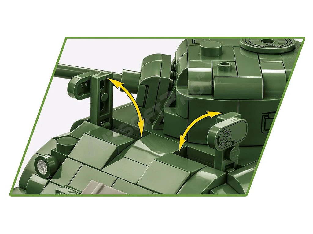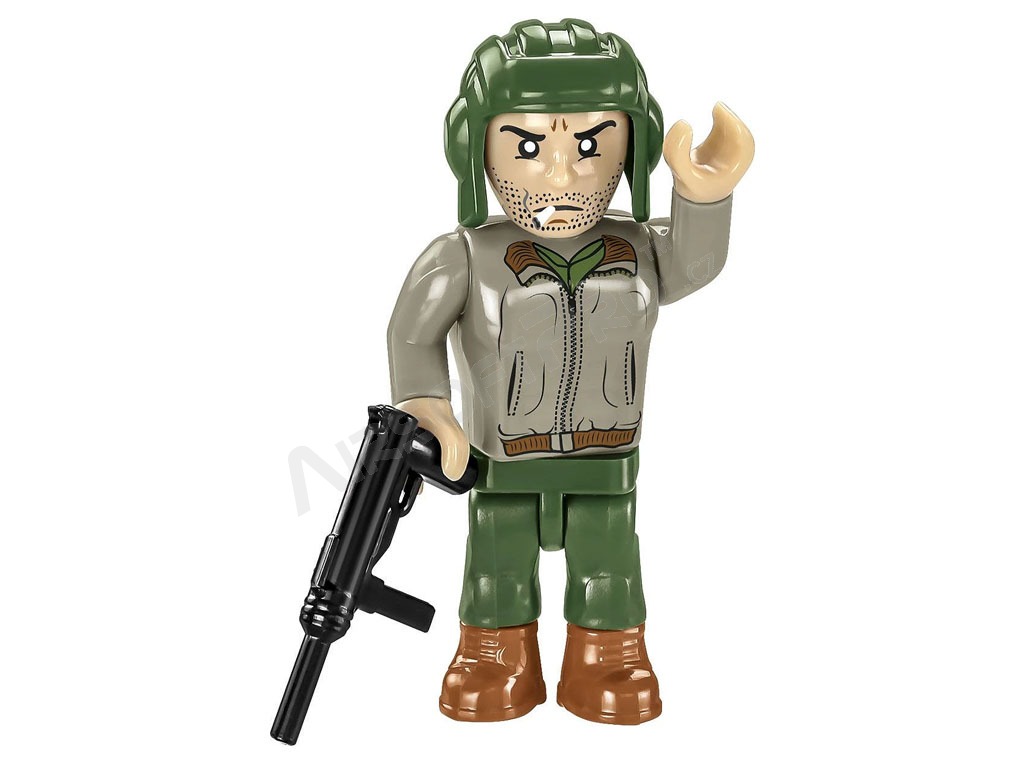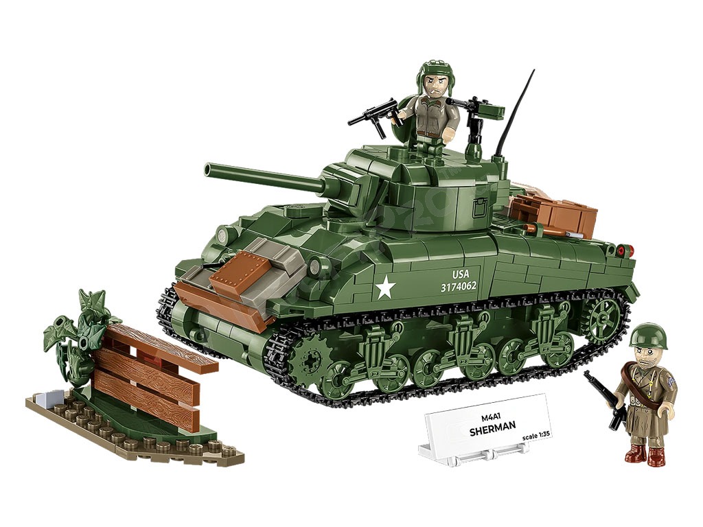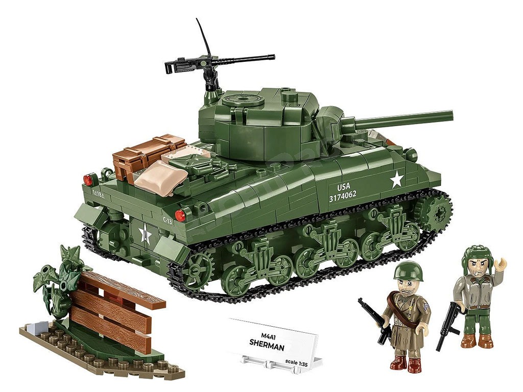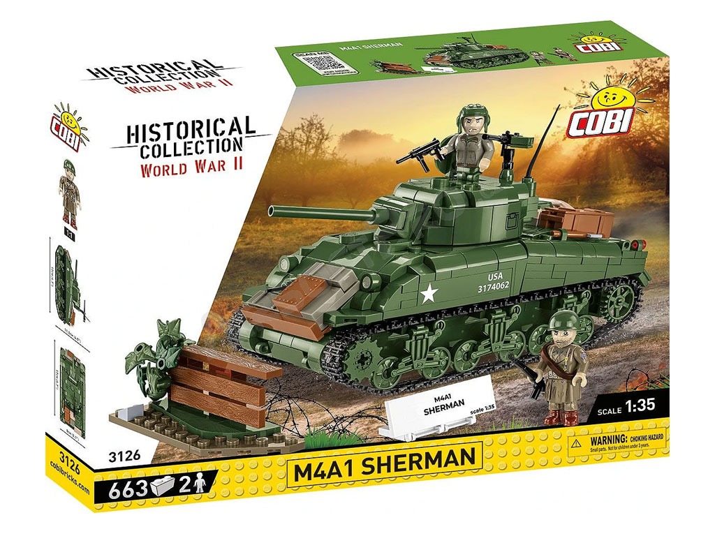 M4 Sherman byl základní americký střední tank vyráběný během 2. světové války. Tato stavebnice COBI je pečlivě navržena v měřítku 1:35 a skládá se ze 663 kostek. Tank má funkční pásy, otočnou věž, pohyblivý kanón, otevírací poklop a servisní kryt s maketou motoru uvnitř. Součástí sady jsou dvě figurky – americký tankista s helmou a samopalem M3 „Grease Gun“ a pěšák oblečený do teplého kabátu s puškou M1 Garand. Je doplněn o prvky prostředí: úsek plotu s živým keřem, který dodává sestavě atmosféru bitevního pole. Potisky na modelech jsou velmi kvalitní, realistické a přesně zachycují značení tanku i detaily uniforem.