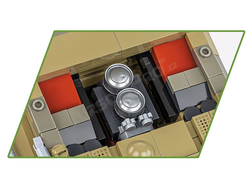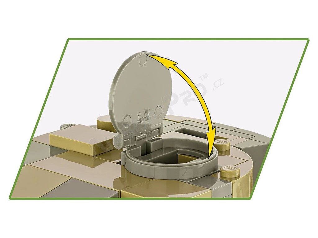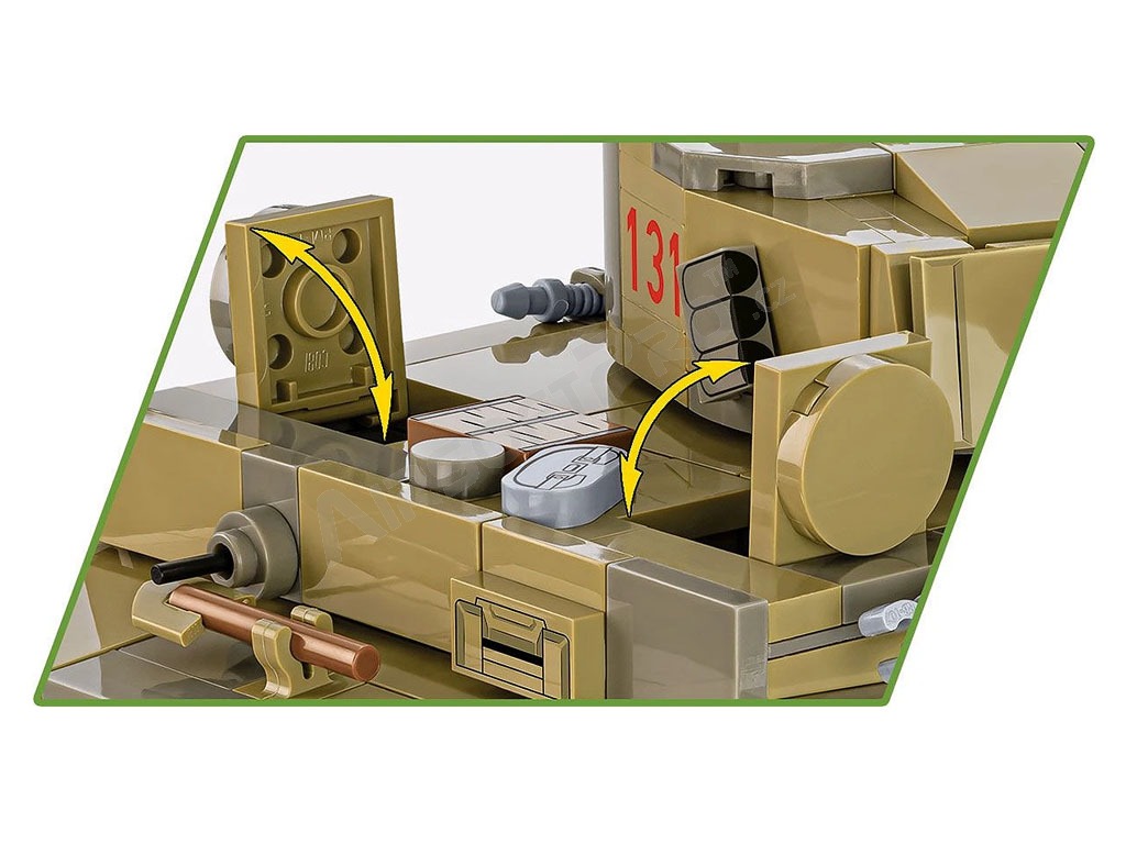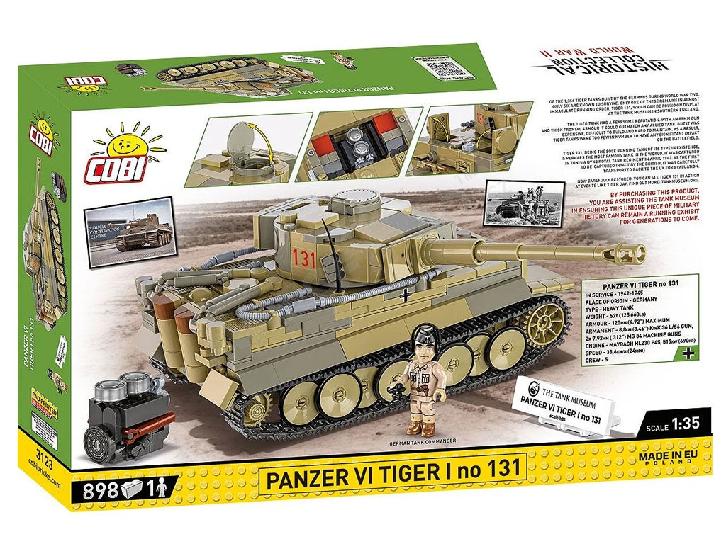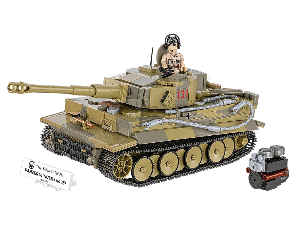 Náš Tiger 131 byl reprodukován s důrazem na detail ve velmi oblíbeném měřítku 1:35! Stojí za zdůraznění, že je to poprvé, co COBI vydává legendární Tiger 131 v této velikosti! Model má pohyblivé prvky, jako je věž a hlaveň děla, a také otočná kola a pásy. Propracovaná sada se skládá z 898 prvků a věrně odráží původní tvary své historické inspirace. Náš výkonný tank je pokryt vysoce kvalitními potisky, které se nestírají. Zvláštní pozornost si zaslouží barvy, které se blíží originálu, a díky nim model vypadá oslnivě! Sada obsahuje model motoru Maybach, který lze vystavit vedle modelu nebo umístit do tanku pod servisní kryt. Model má pohyblivá kola a pásy složené z mnoha článků. Během hry můžete tank řídit a sledovat fungující trakci pásů! Poklopy se otevírají a pod nimi je prostor pro standardní figurky COBI. Figurka představuje velitele tanku v tropické uniformě. Celou sadu doplňuje bílá plaketa s vytištěným názvem tanku a logem Tankového muzea!