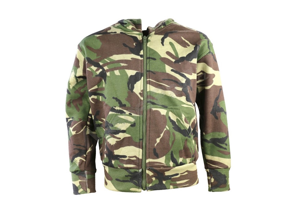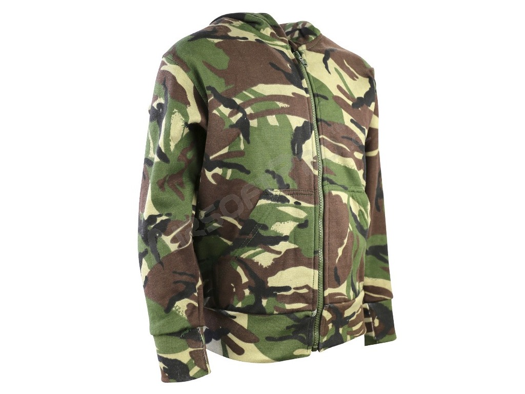 Dětská fleece mikina s kapucí v maskovacím vzoru DPM (Disruptive Pattern Material - obdoba Woodland vzoru), která díky měkké fleecové podšívce skvěle hřeje a je velmi pohodlná na celodenní nošení.