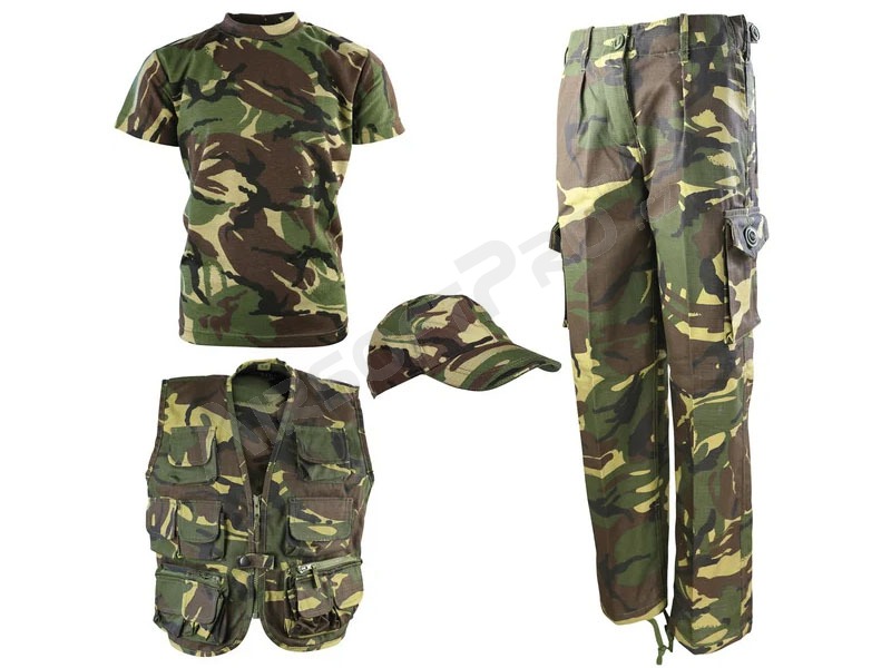 Perfektní volba pro malé průzkumníky! Dětská sada Kids Adventurer obsahuje kompletní oblečení v maskovacím vzoru DPM (Disruptive Pattern Material - obdoba Woodland vzoru) – ideální pro hry v přírodě, táboření nebo airsoft.