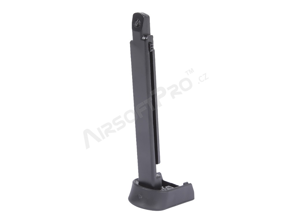 The magazine is compatible with both non-blowback and blowback versions of the pistol. It is made of metal with a plastic base plate.