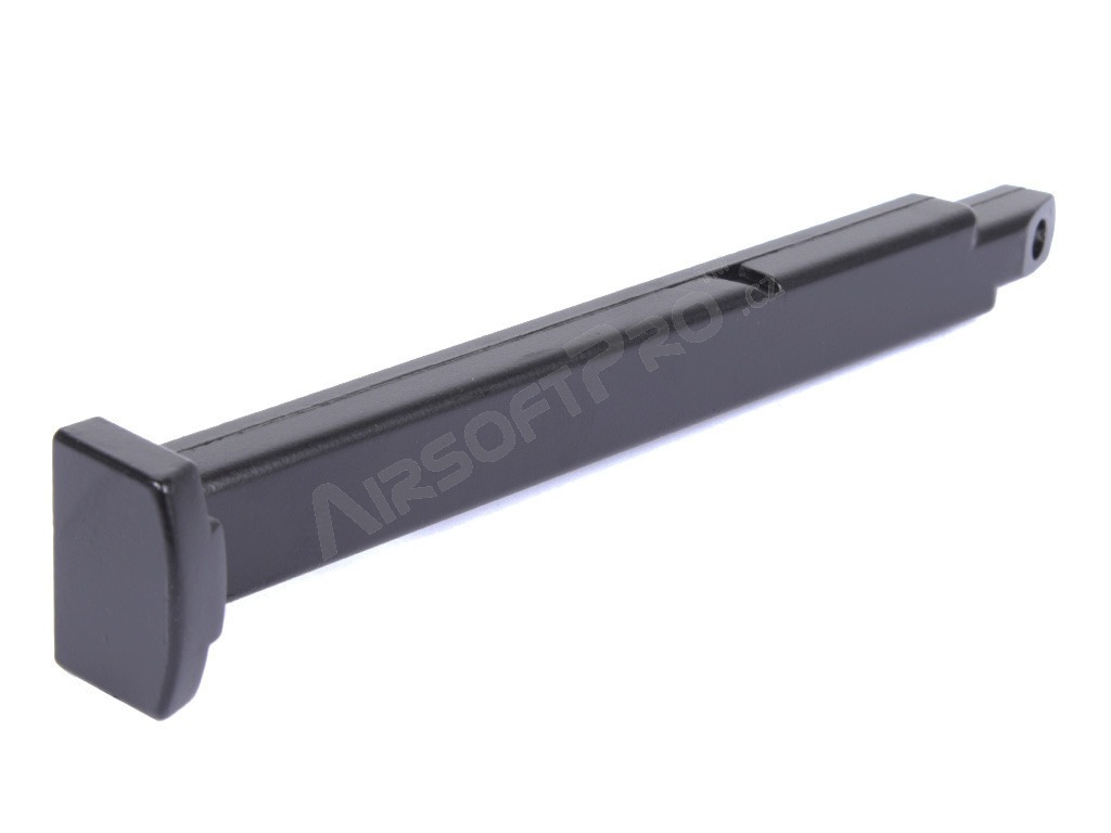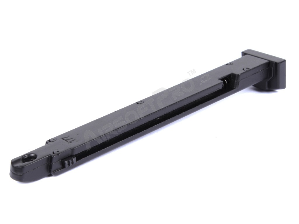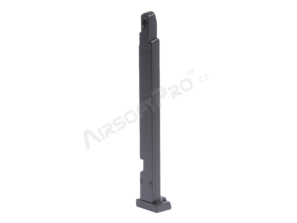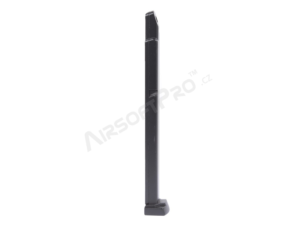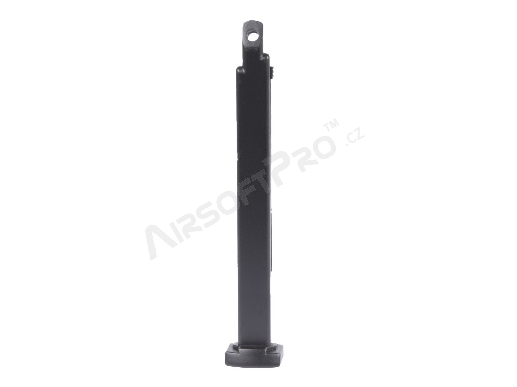 The magazine is compatible with both non-blowback and blowback versions of the pistol. It is made of metal with a plastic base plate.