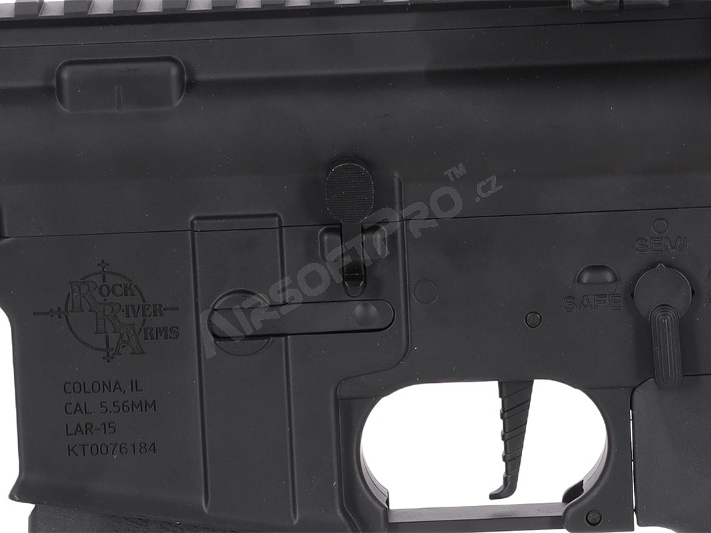 The replica features licensed Rock River Arms® markings, an American manufacturer of AR-15 rifles and accessories. The receiver is marked with an individual serial number and RRA branding.