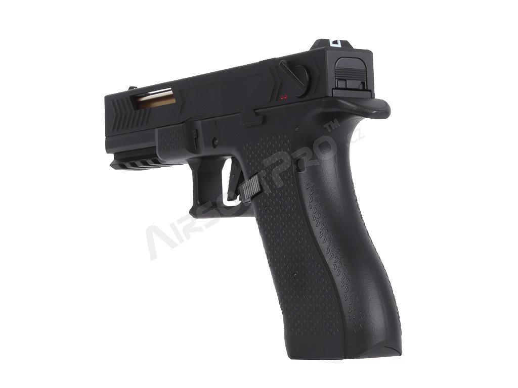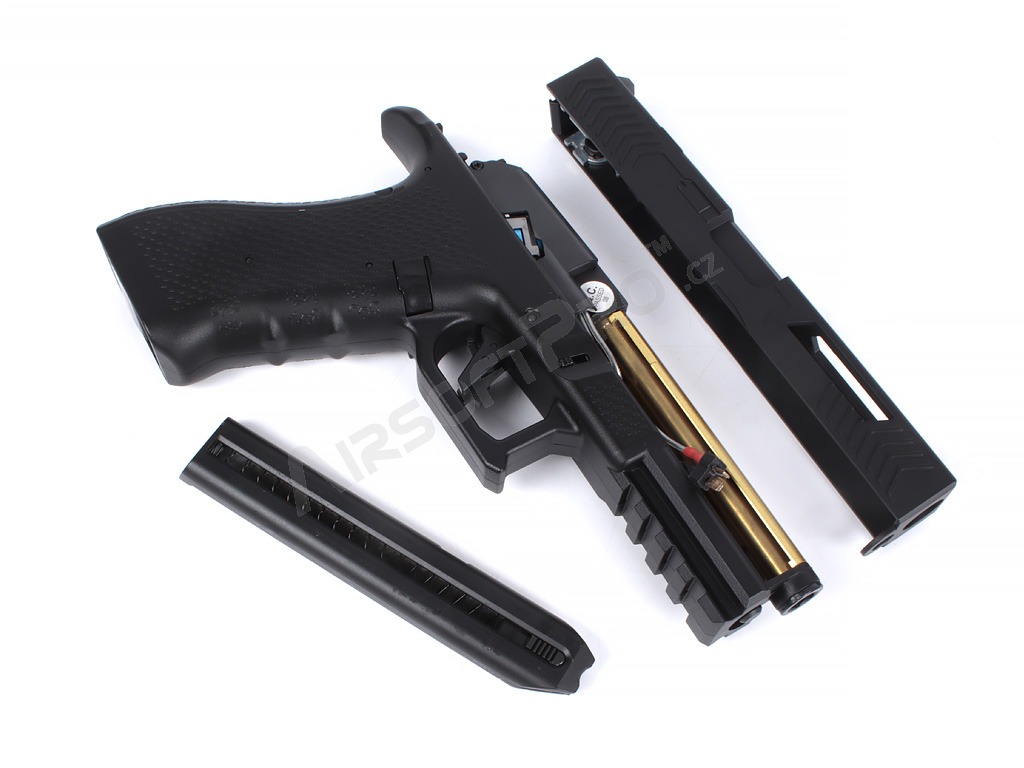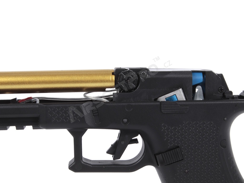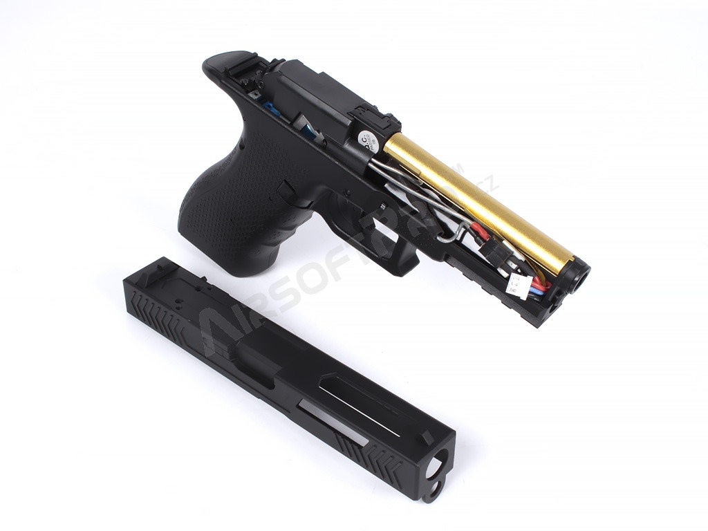Under the slide is a small Li-Po battery that powers the internal mechanism. This gives the pistol a compact, well-balanced body; the magazine is specially narrow so everything fits neatly into the pistol frame. Polymer parts are made from durable material, while key internal components are metal.