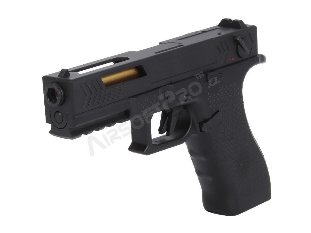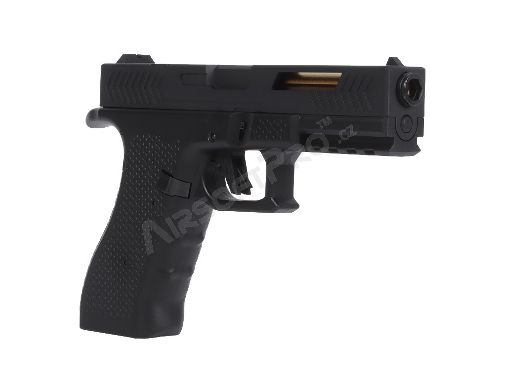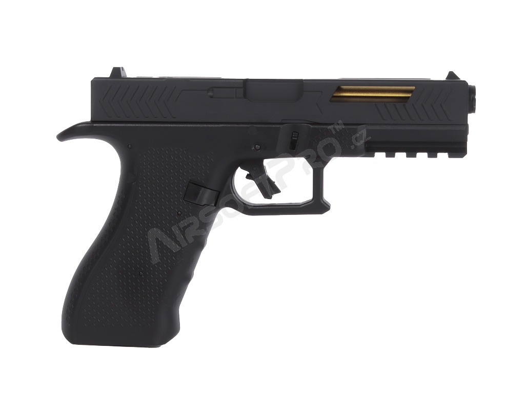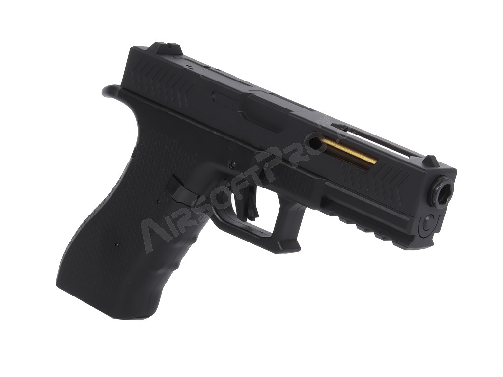 Under the slide is a small Li-Po battery that powers the internal mechanism. This gives the pistol a compact, well-balanced body; the magazine is specially narrow so everything fits neatly into the pistol frame. Polymer parts are made from durable material, while key internal components are metal.