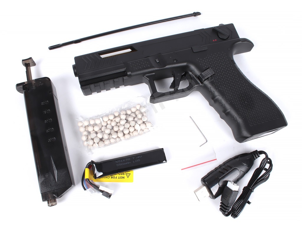 The package includes: the pistol, magazine, battery, charging cable (USB), speedloader and cleaning rod.