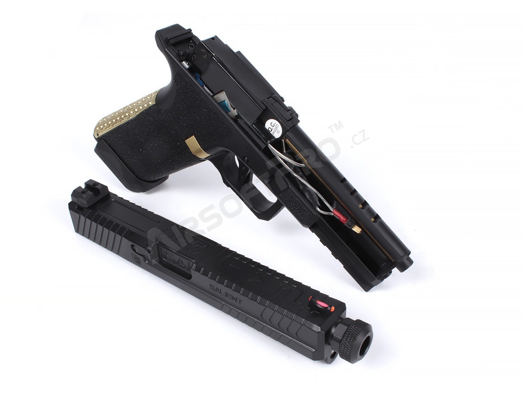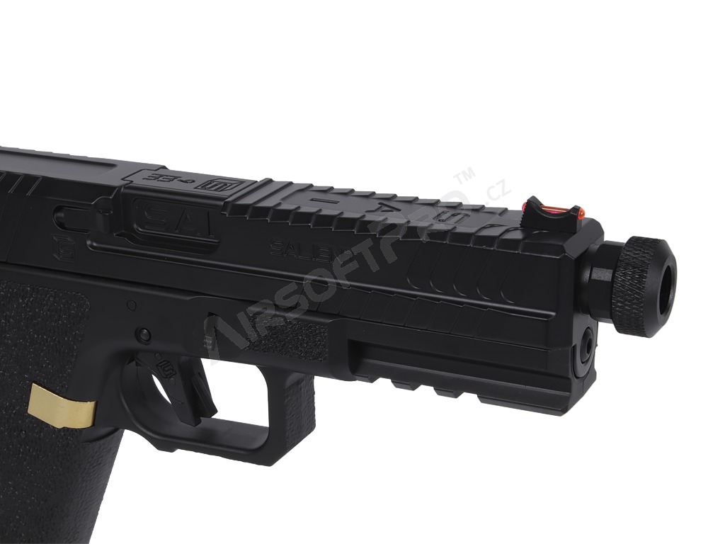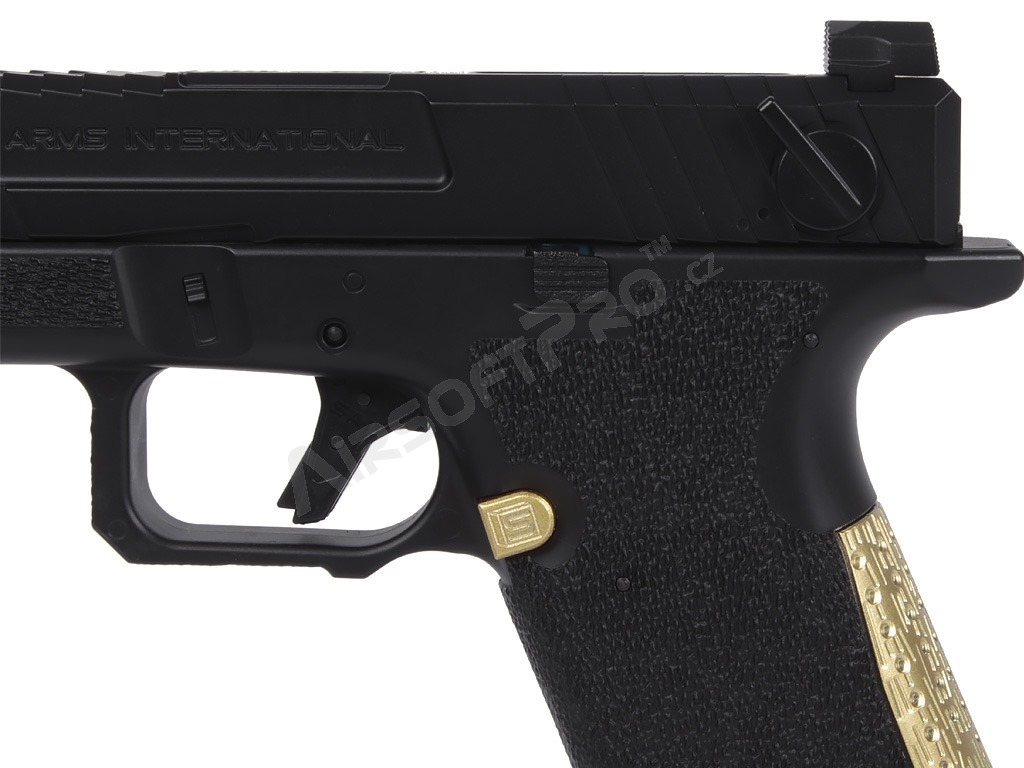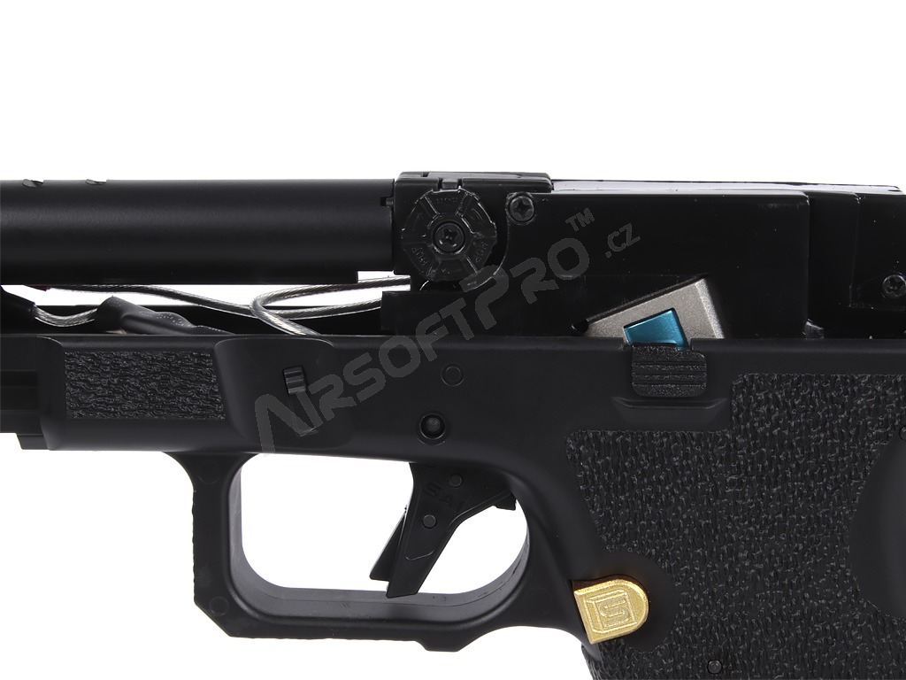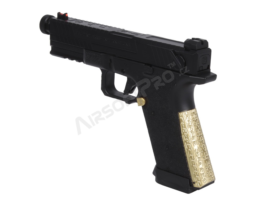 The body combines metal and polymer parts — a polymer frame with improved ergonomics and an aggressive grip texture for a secure hold. The design is complemented by gold decorative elements that emphasize the "Blue Edition" look. The pistol features a plastic grip frame and realistic markings on the frame and slide. Under the protective thread cover there is a 14 mm left-hand threaded barrel. The sights are fiber-optic.