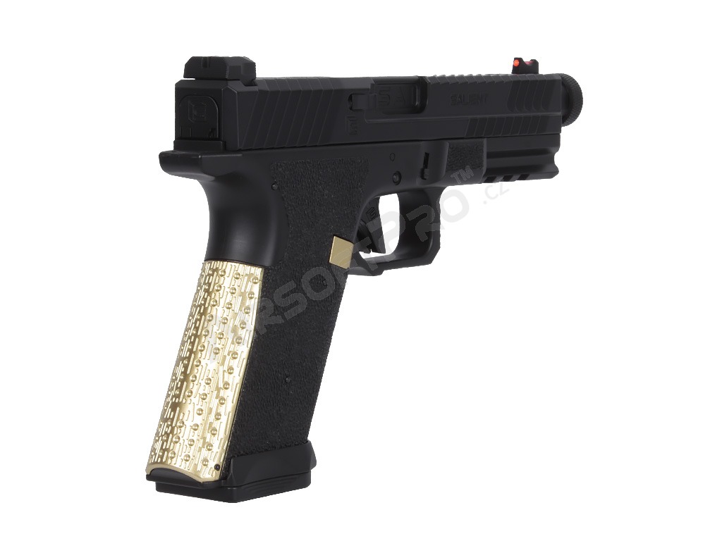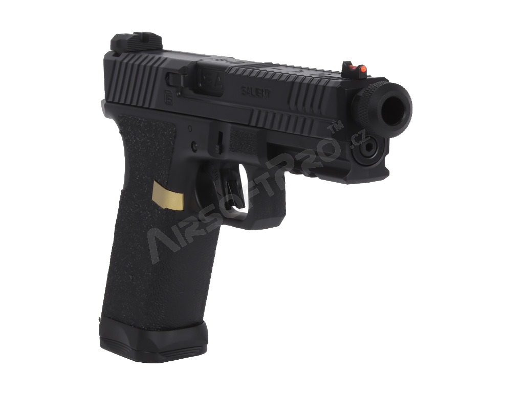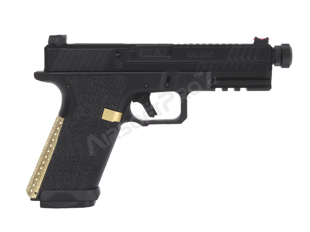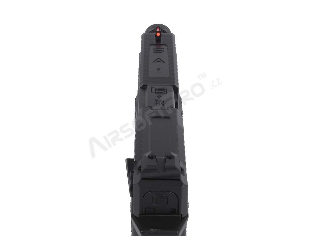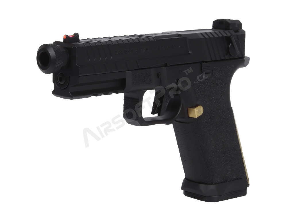 The body combines metal and polymer parts — a polymer frame with improved ergonomics and an aggressive grip texture for a secure hold. The design is complemented by gold decorative elements that emphasize the "Blue Edition" look. The pistol features a plastic grip frame and realistic markings on the frame and slide. Under the protective thread cover there is a 14 mm left-hand threaded barrel. The sights are fiber-optic.