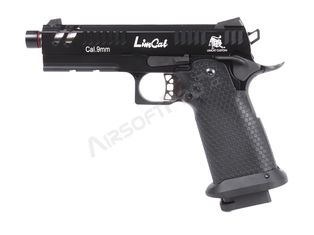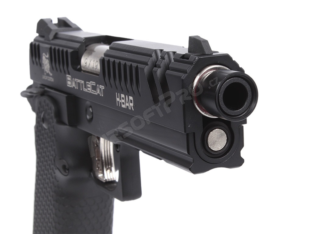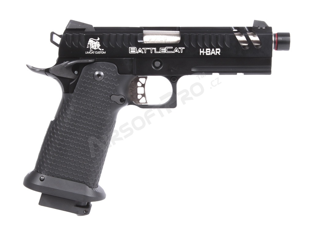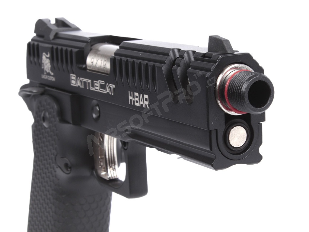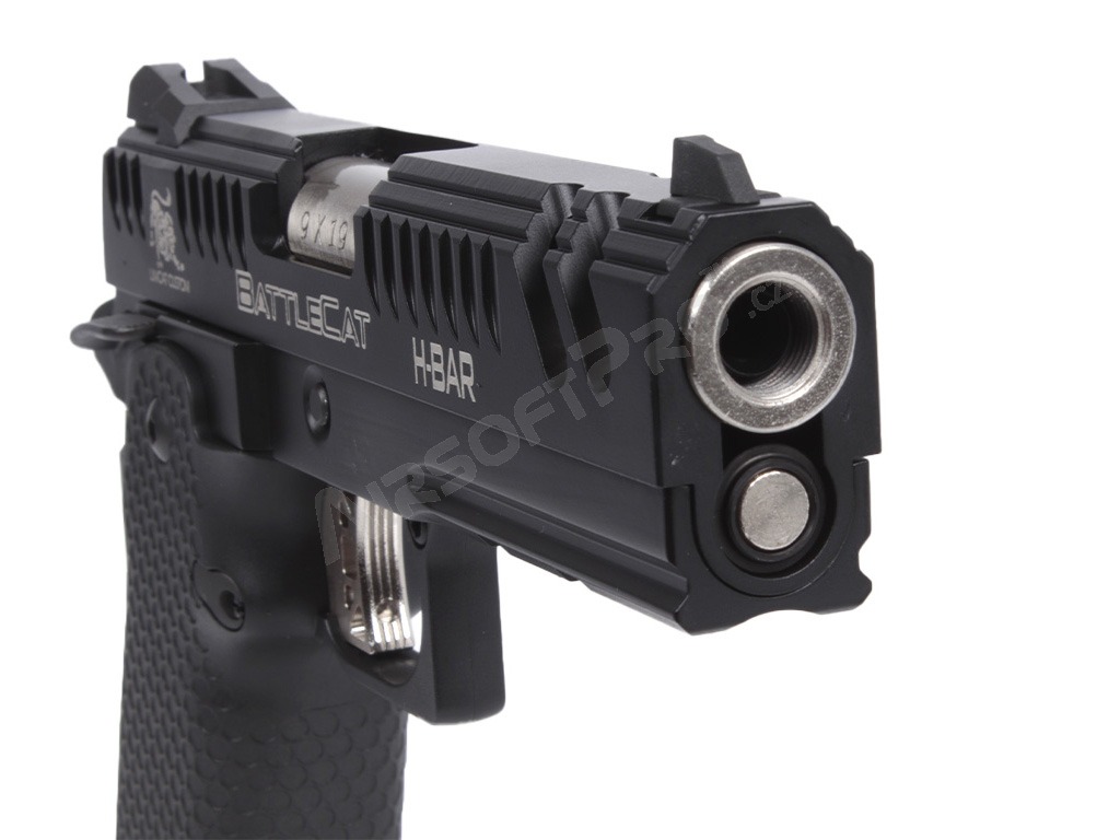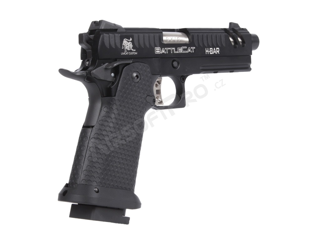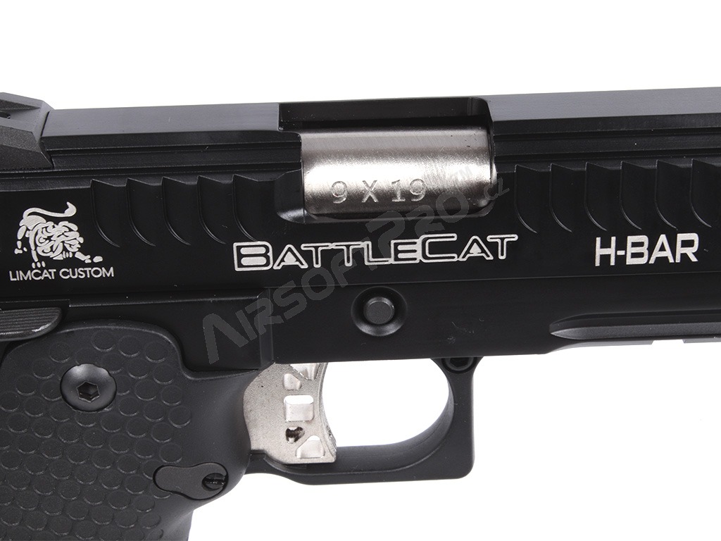 The slide and frame are CNC-machined from metal, ensuring high durability and precise fit. The slide features laser-engraved "Limcat" and "Battlecat" markings, which emphasize the premium look of the model. The pistol is ready for a silencer or compensator thanks to a 14 mm CCW adapter. The outer barrel has an M11x1 CW internal thread.