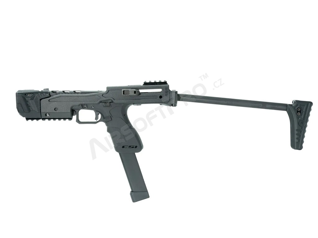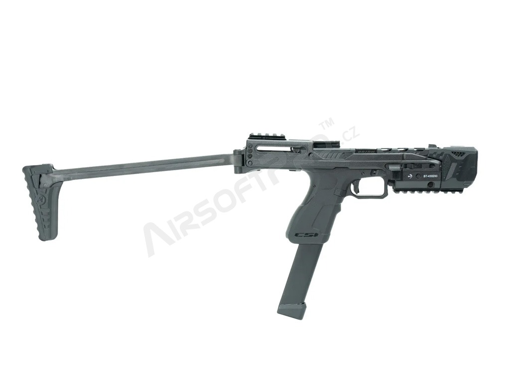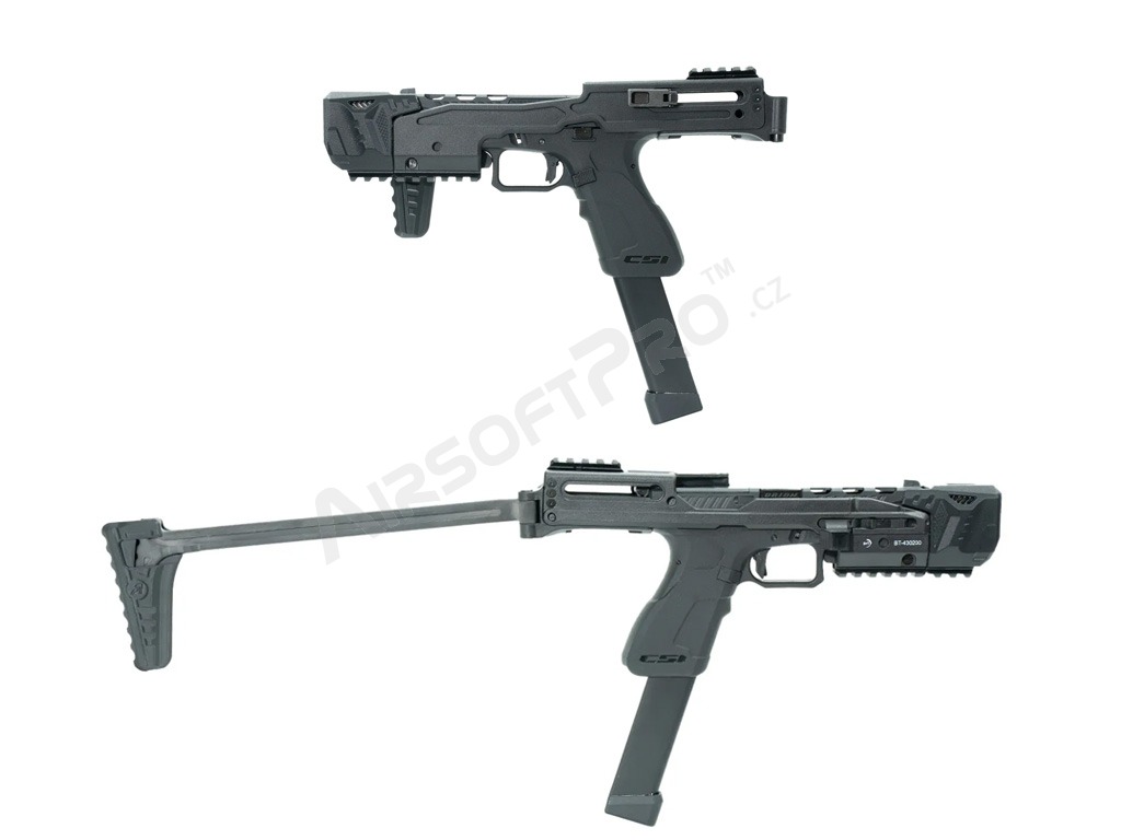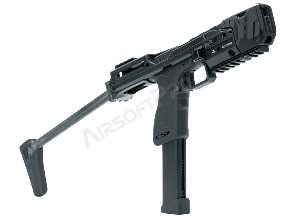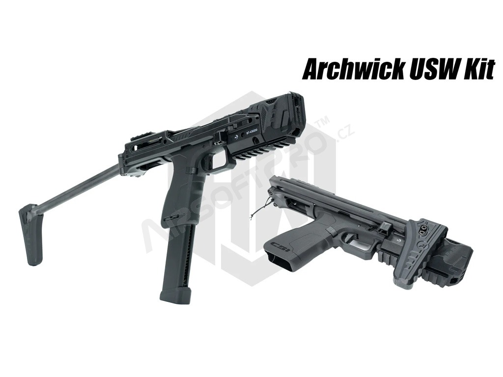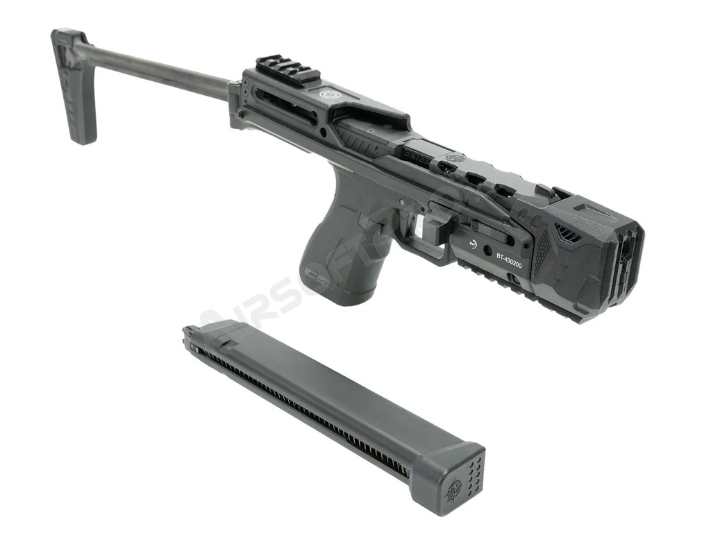 The B&T USW conversion kit is made of glass-fiber reinforced polymer and bears official B&T markings and logos. The folding stock allows for a lightning-fast transition from a compact pistol to a stable platform for precision shooting at longer ranges.