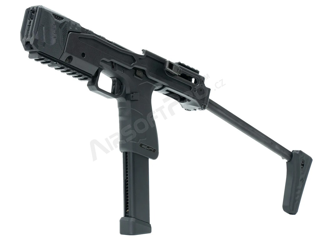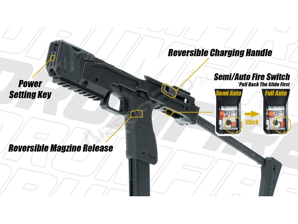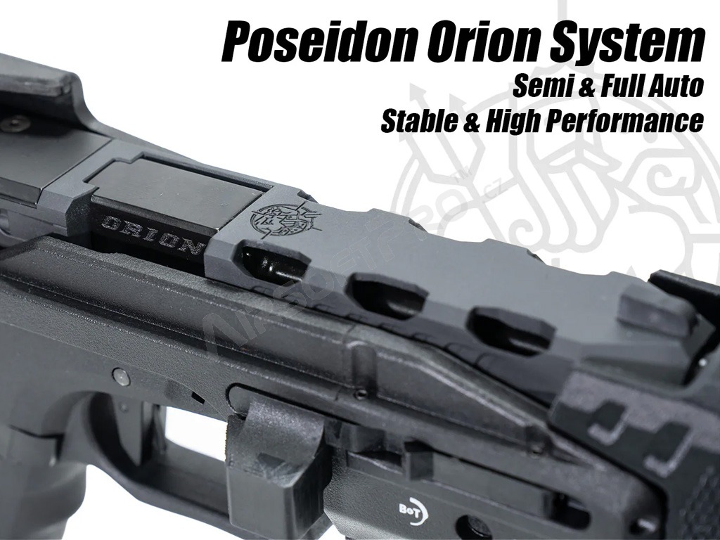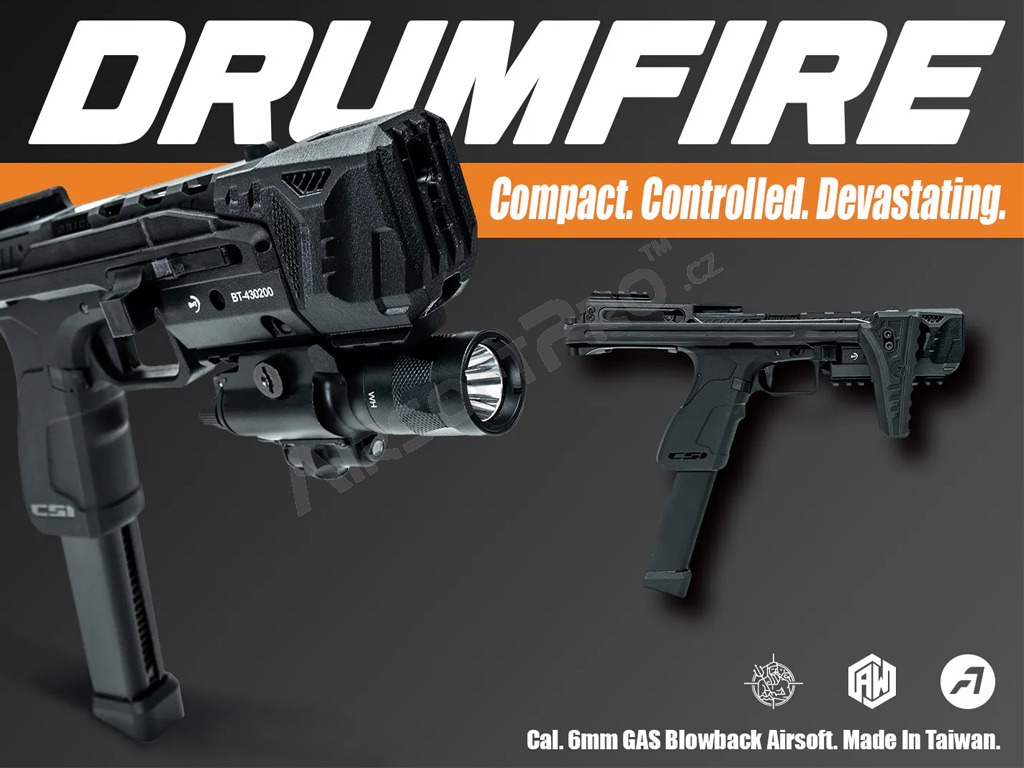 The pistol features a precision Poseidon Orion slide and a lightweight yet extremely durable frame made entirely of heavy-duty nylon. RMR mount on the top of the slide (it is not possible to use a folding stock) or a RIS rail on the folding stock allow for easy installation of a red dot sight. Thanks to the built-in fire selector, you can easily switch between Semi (single shot) and Full Auto (burst) modes, making the Drumfire a formidable opponent in CQB scenarios.