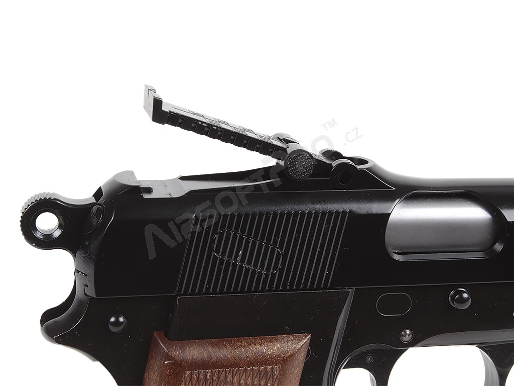 The airsoft version of the Browning Hi-power M1935 pistol with an detachable stock is a perfectly crafted, all-metal replica in black.