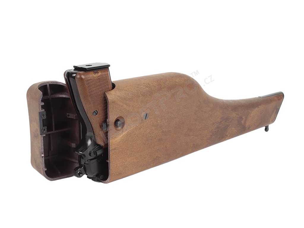 The package includes a detachable stock, which can also be used as a carrying case. The stock is plastic, imitation of wood pattern.