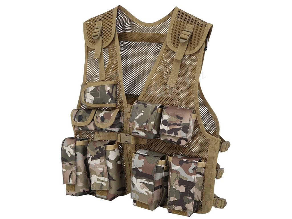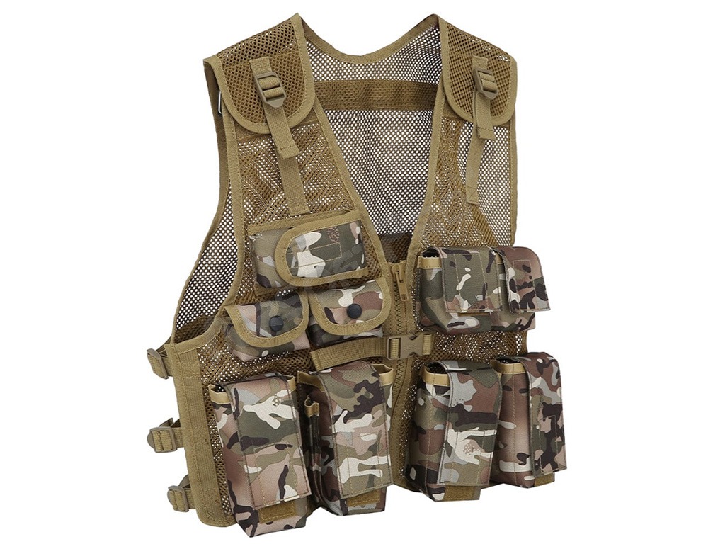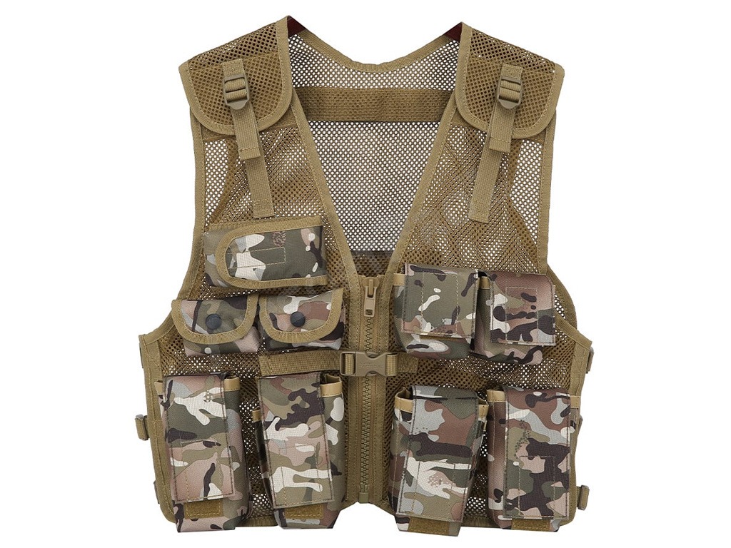 It features lightweight breathable mesh construction with adjustable straps on the shoulders, front and sides. It has a zip front with quick-release buckle and 9 pockets on the front. The vest is made from 600D Tac-Poly making it tough and durable and one size fits all.
