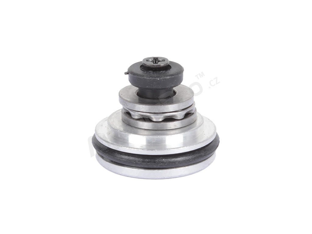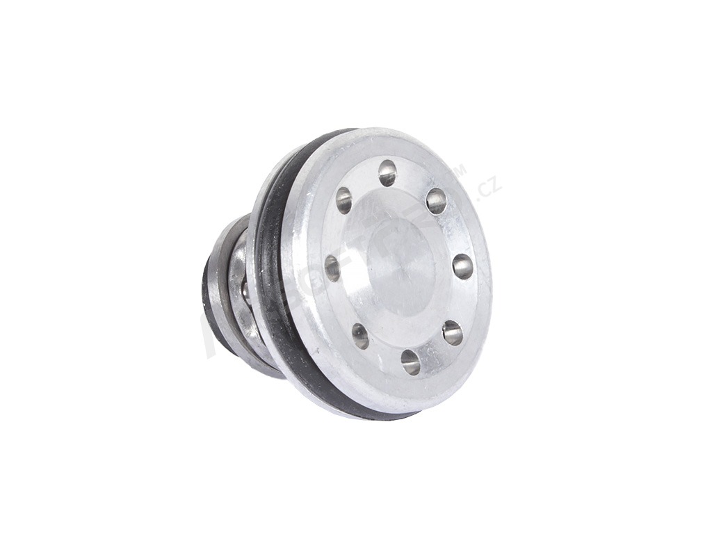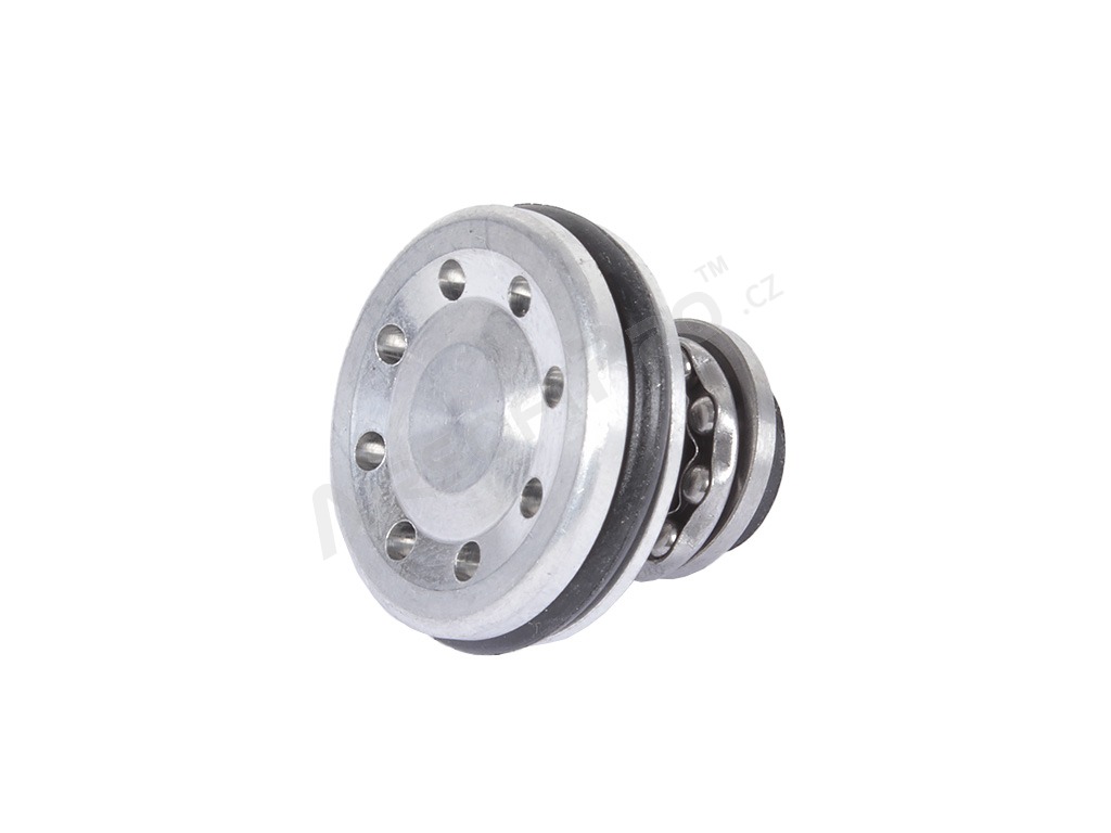 Aluminum piston head with counterpressure function and bearing, designed for upgrading airsoft guns. Thanks to CNC machining, it offers precise dimensions and higher durability compared to standard plastic parts (12 g).