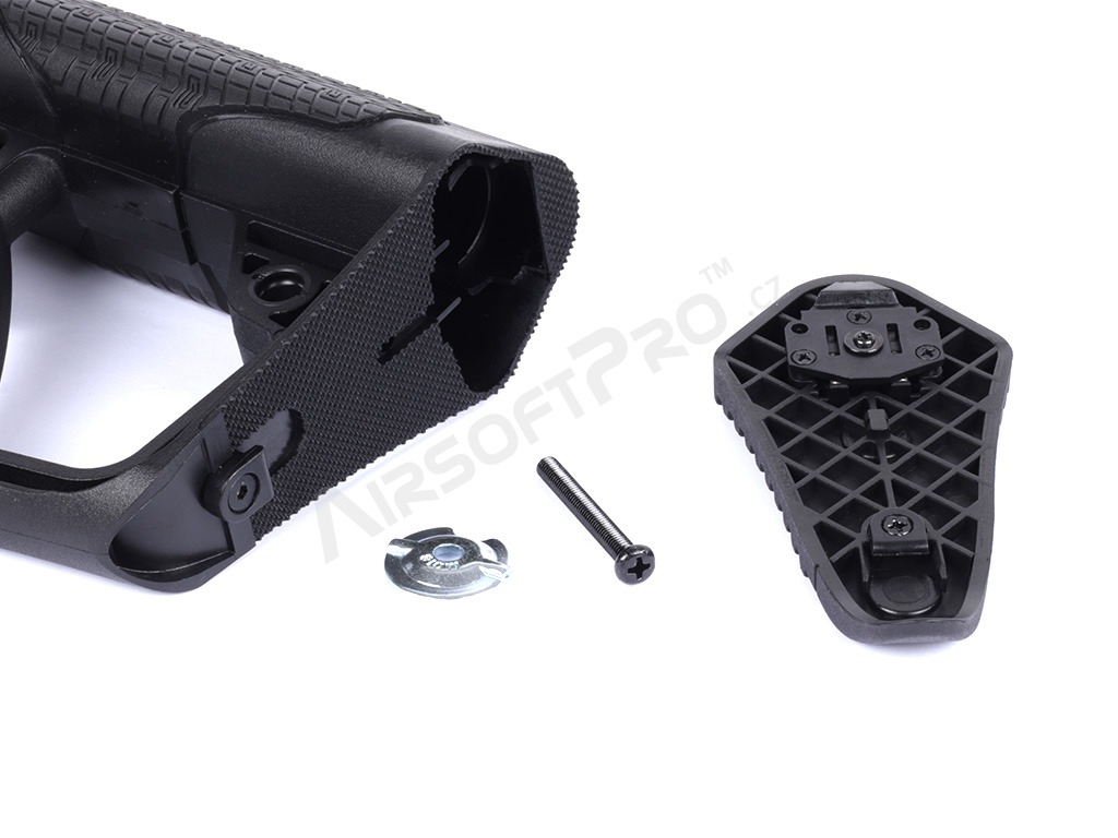 - Battery-friendly design: The stock is designed to accommodate even larger batteries. Thanks to the button-release mechanism, the butt pad can be easily flipped open, ensuring instant access to the battery compartment without the need for tools.