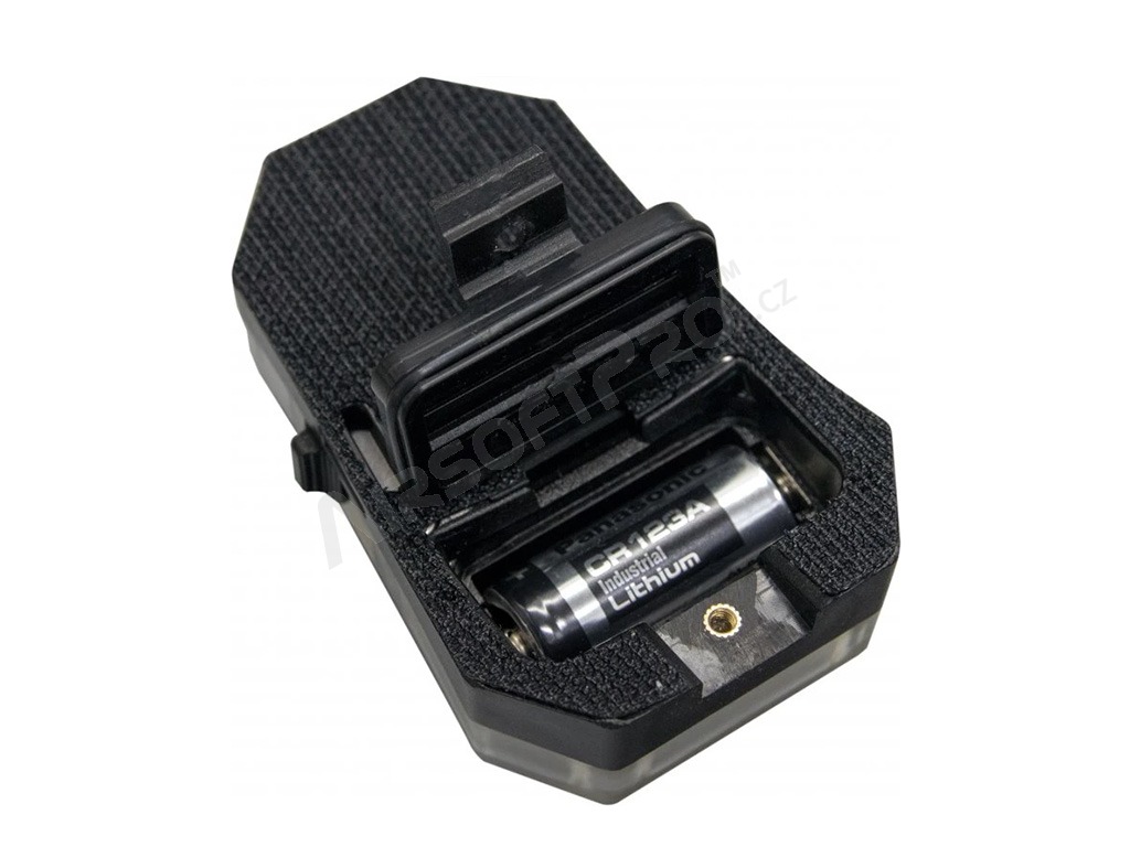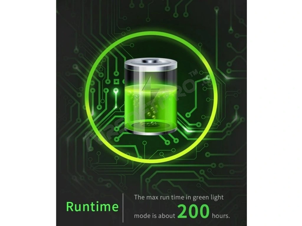 Powered by 1x CR123A battery (not included). Operating time is up to 200 hours in steady green light mode, 56 hours in white flashing light mode, and 10 hours in IR mode.