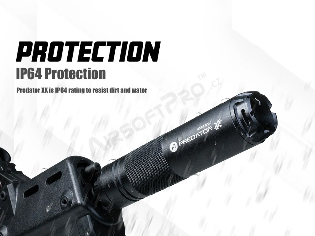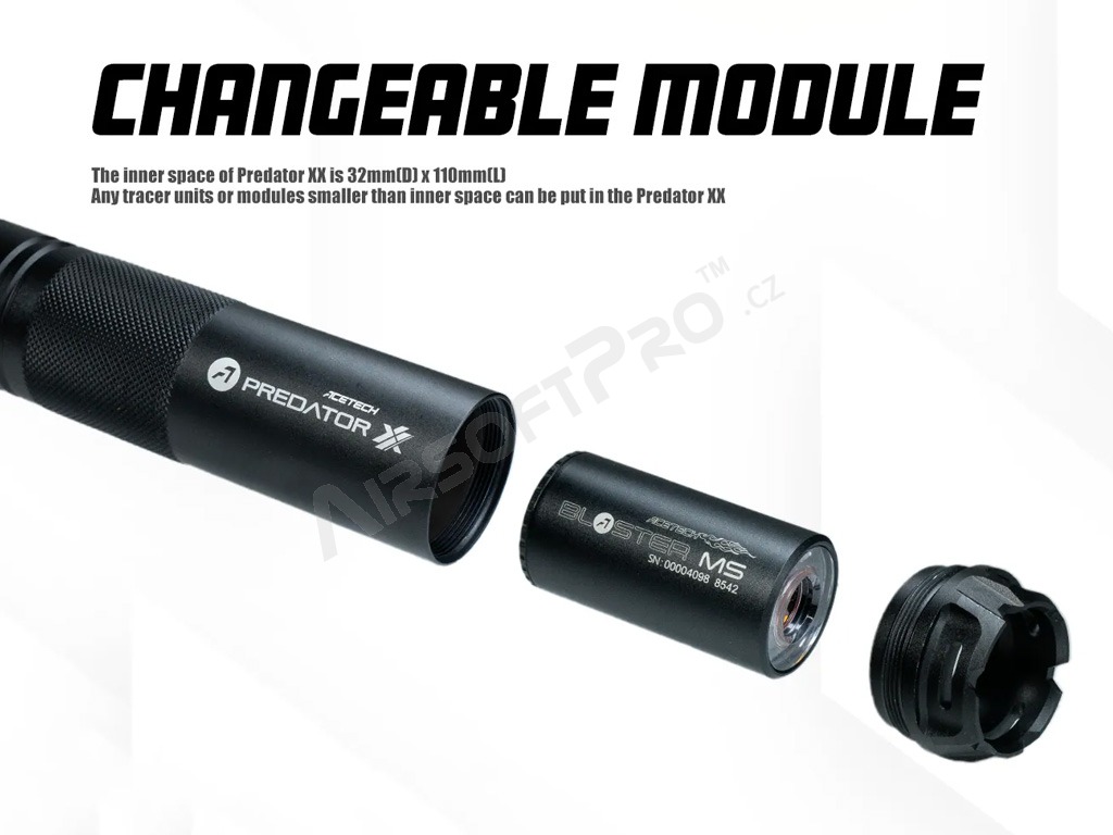 The most interesting feature of the Predator XX, however, is the simulation of muzzle flash when fired with a multi-coloured flame effect. The flame effect depends on the volume of gas or fog around the muzzle, more volume makes better effect. There are 3 LEDs on the end of the silencer that illuminate the departing BB and gas around the barrel when fired. The effect is best seen when used on gas guns, when the residual gas after the shot is illuminated. The effect is also visible when used on electric weapons, although slightly dimmer. With Predator XX, you can also choose the colour and mode of the flame imitation. There are 2 tracer modes and a total of 11 flame imitation variations - from single colors, to RGB, Rainbow and Dynamic Rainbow modes.