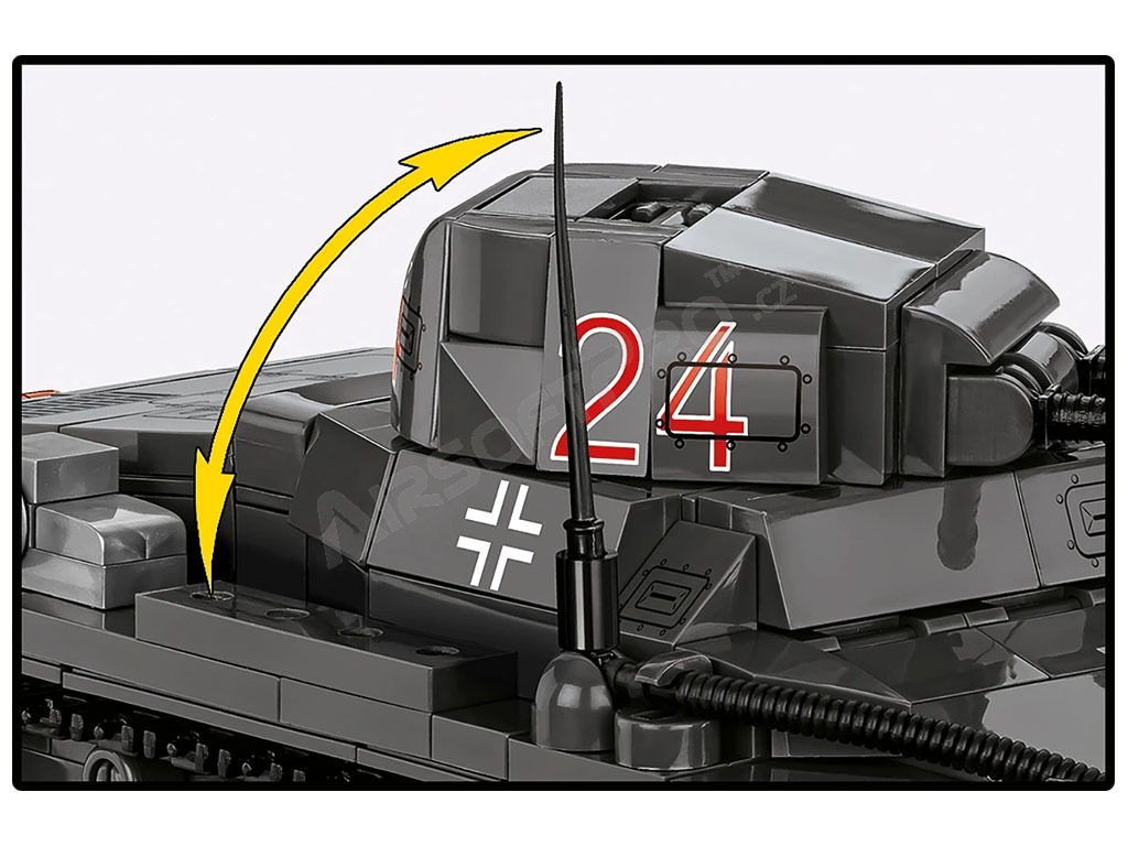 - The turret rotates 360° and the gun barrel changes angle, allowing the model to be placed in various realistic positions.