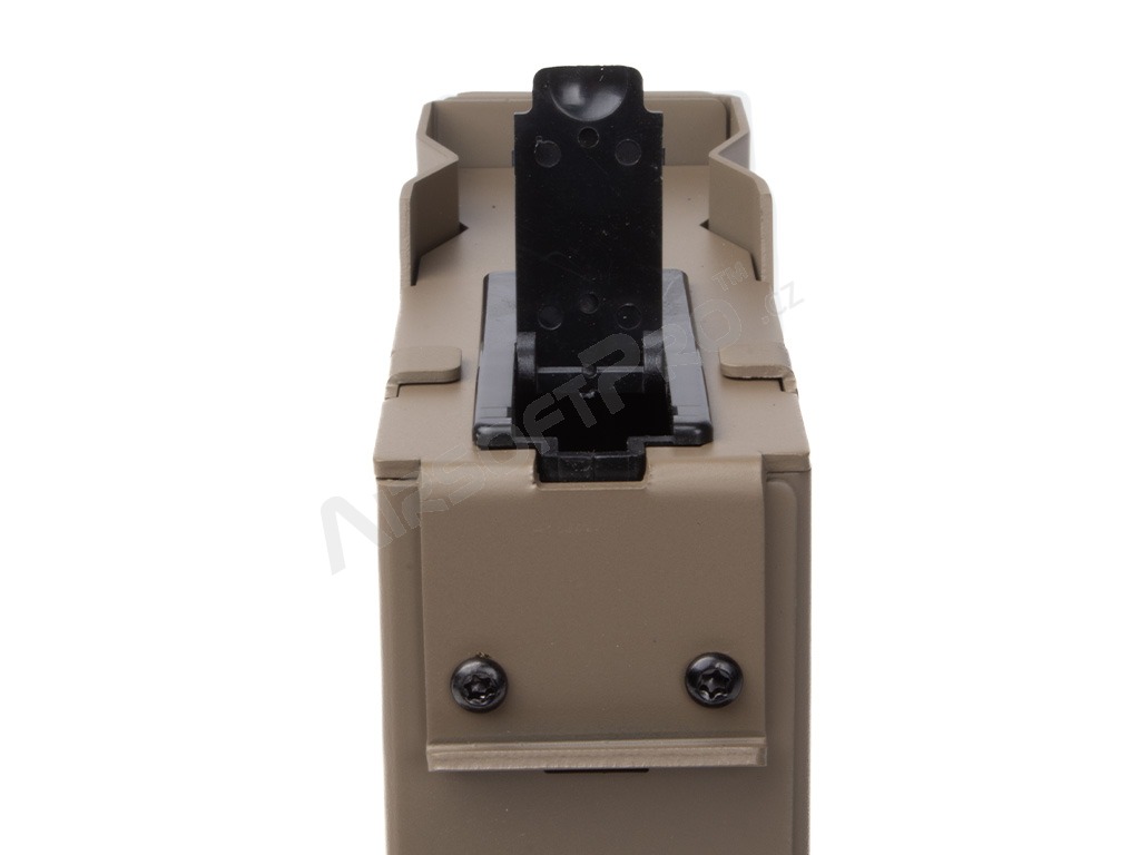 Holds up to 500 BBs, which are simply poured in through the top closable opening in the magazine. A cogwheel protruding from the bottom of the magazine winds up the internal mechanism, which automatically feeds the BBs into the gun. In theory, it is therefore possible to empty the entire magazine in one full wind-up before firing.