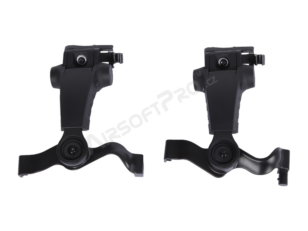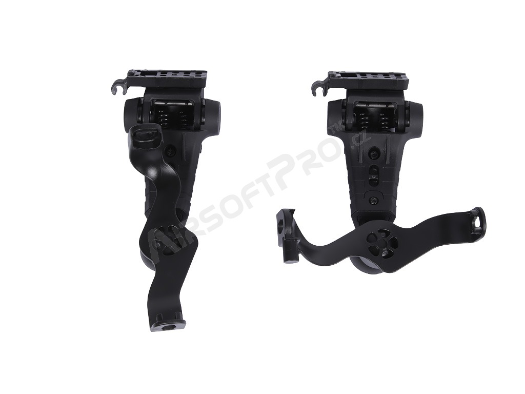 The mount is compatible with ARC rails (e.g., FAST and MICH helmets). It allows the headset to be flipped up or down to the back of the helmet thanks to the rotating base joint. The mount joints allow for easy adjustment to different head shapes. Optimized for glasses and night vision. The mount has a robust yet lightweight design that makes efficient use of space on the side rail.