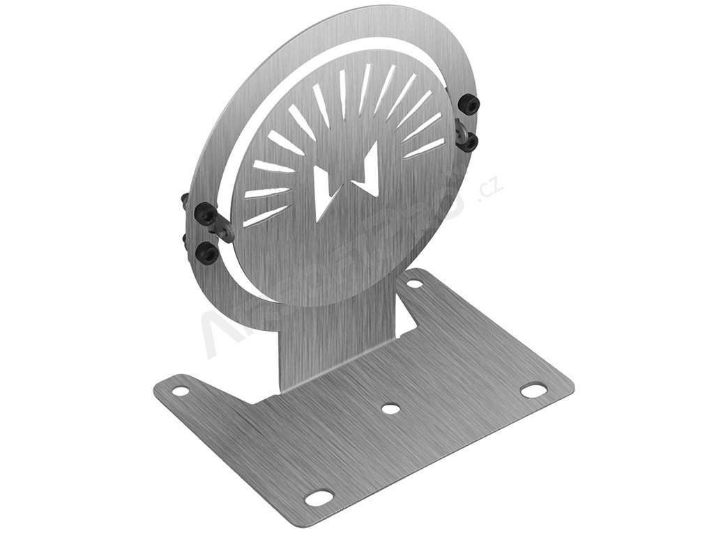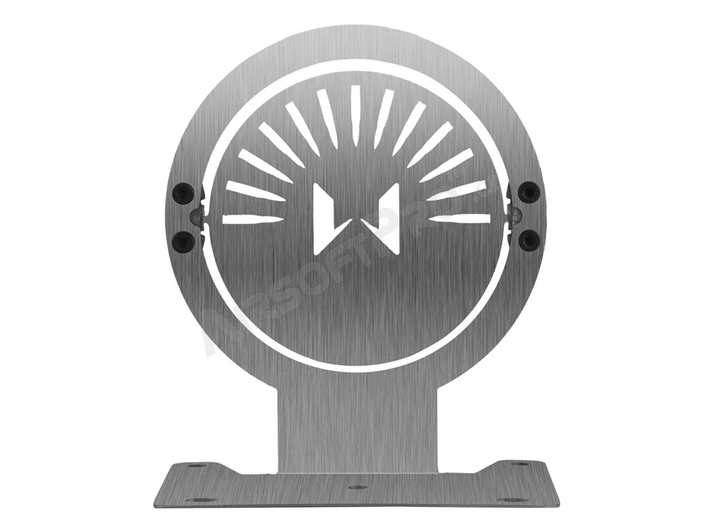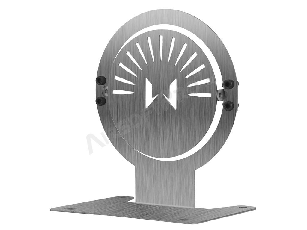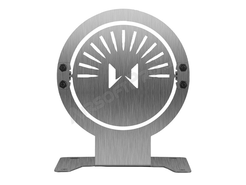 The target and base are made of one piece of laser-cut 1.2 mm steel sheet with a brushed finish. The target has machined edges for safe handling.