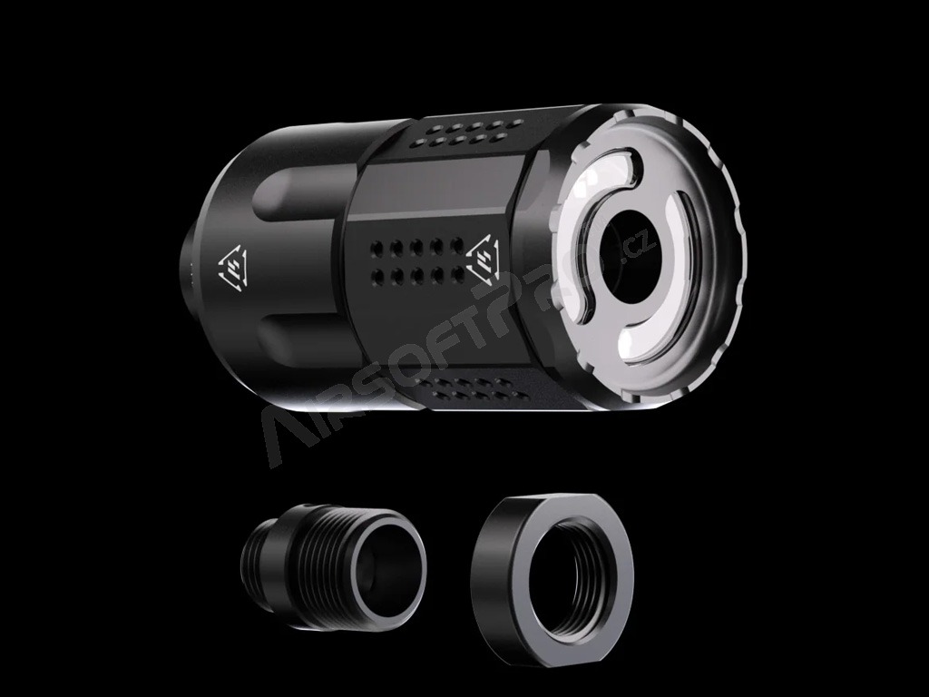 Le compensateur est doté d'un filetage standard à gauche M14 et d'un adaptateur pour le filetage à droite M11 du pistolet. Il peut donc être utilisé sur presque tous les pistolets d'airsoft.