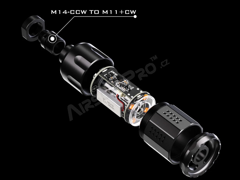 Thanks to four powerful 5 mm high brightness LEDs placed on the front side, the silencer can produce a spectacular imitation of a shot.