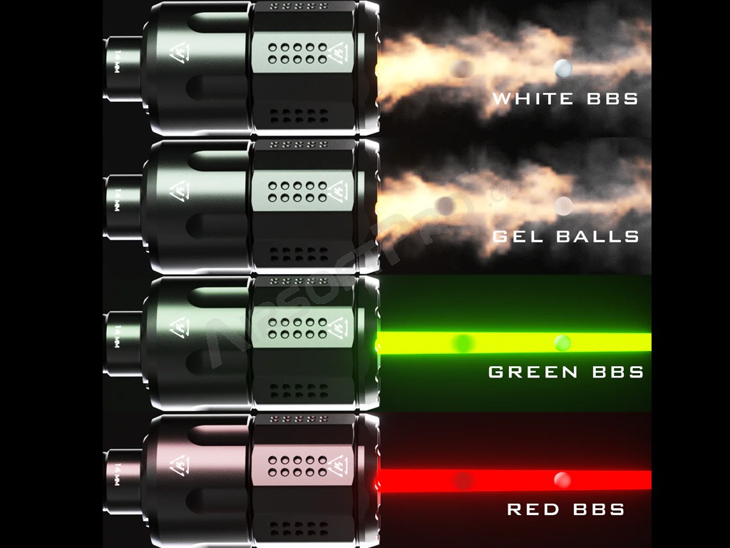 Le silencieux peut allumer des balles lumineuses vertes et rouges ou des balles de gel. Vous pouvez également utiliser les balles blanches classiques qui, bien qu'elles ne s'allument pas, peuvent être utilisées dans un effet de tir fictif. Essayez différentes couleurs de billes pour obtenir différents effets.