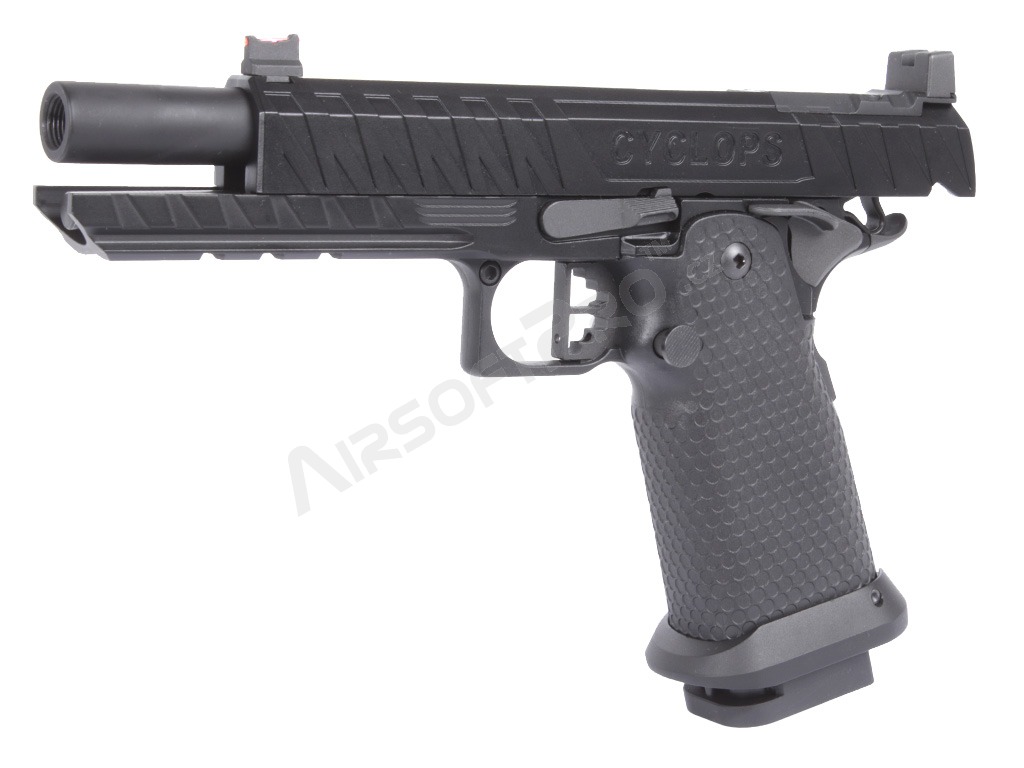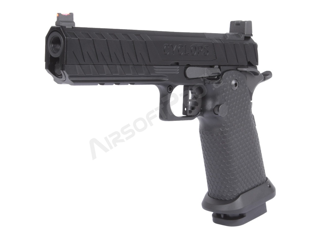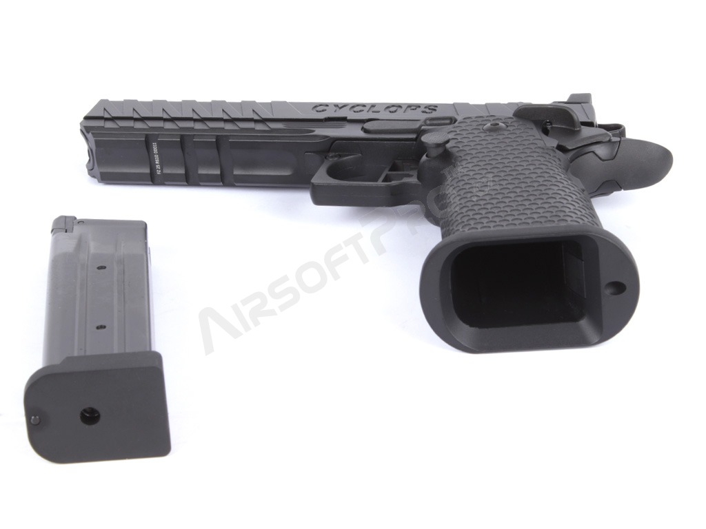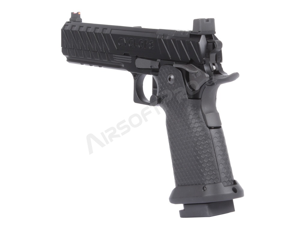 Le pistolet est construit sur un cadre robuste avec une culasse en aluminium qui donne au pistolet la durabilité nécessaire et un poids réaliste de 1080 g. La glissière présente des marquages laser authentiques et une gravure CYCLOPS profonde.