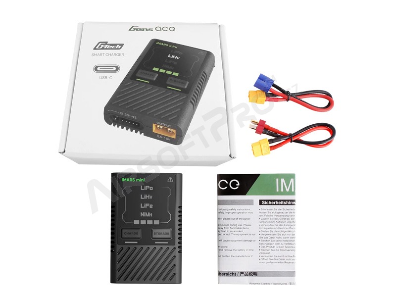 Il s'agit d'un produit de la série Gens ace G-Tech Smart Eco. Lorsque la batterie Gens ace G-Tech Smart est connectée au chargeur Imars Mini, le chargeur identifie automatiquement via le connecteur Smart Balance le type de batterie, la tension et le courant de charge recommandés par le fabricant de la batterie. Une fois la batterie G-Tech Smart connectée, le chargeur démarre automatiquement la charge dans les 5 secondes.