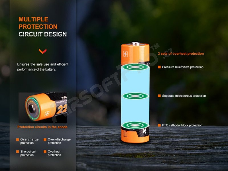 La batterie dispose également d'une protection intégrée contre la décharge complète et les courts-circuits (le courant de décharge continu maximal est d'environ 3 A). La batterie convient donc aux appareils photo, aux systèmes de navigation, aux équipements de laboratoire et à d'autres appareils. Elle est également compatible avec toutes les lampes frontales et lampes de poche Fenix équipées de piles AA. Il s'agit notamment des Fenix E12, Fenix E20, Fenix LD12R, Fenix LD22, Fenix HM23, Fenix HP16R.