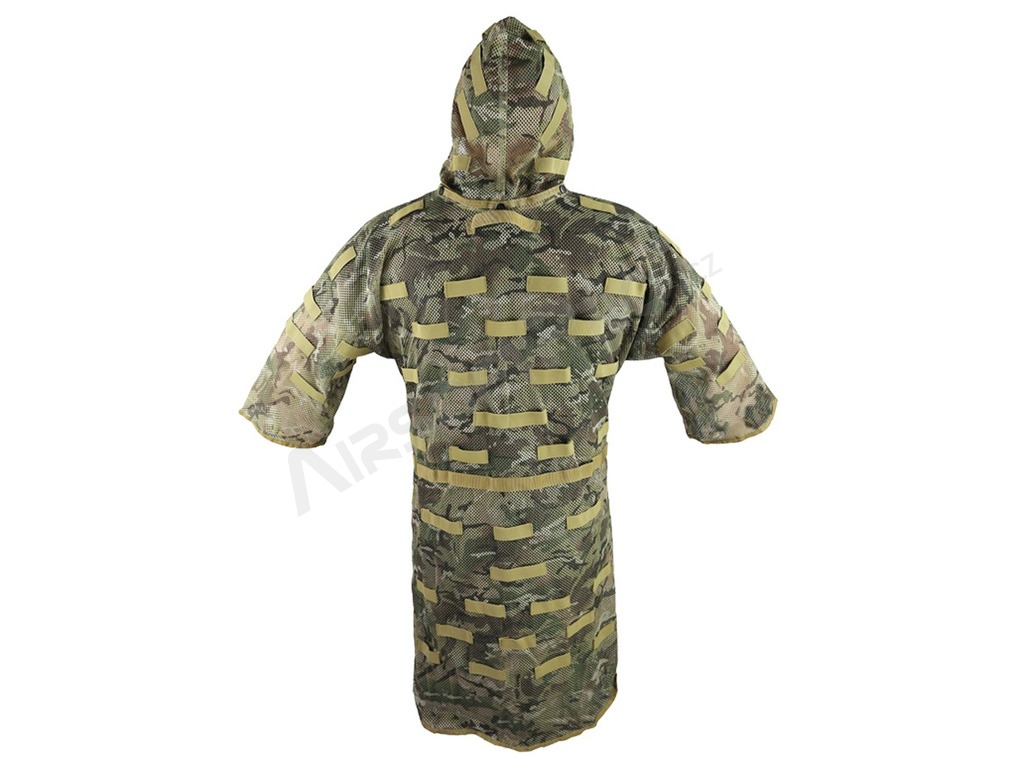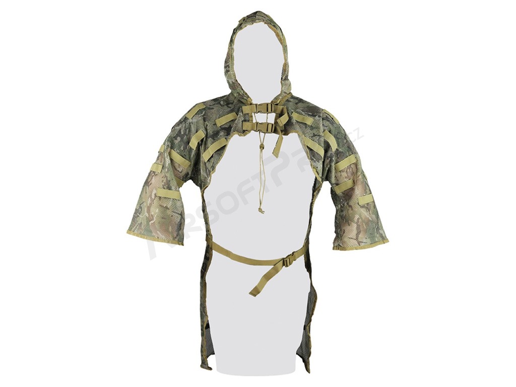 La veste comprend une capuche amovible qui permet de casser la silhouette de la tête et d'augmenter le niveau général de camouflage. La veste comporte deux sangles de poitrine et une sangle de taille, toutes équipées de boucles pour un détachement facile, ce qui permet de l'enfiler et de la retirer rapidement sans retarder inutilement le jeu.