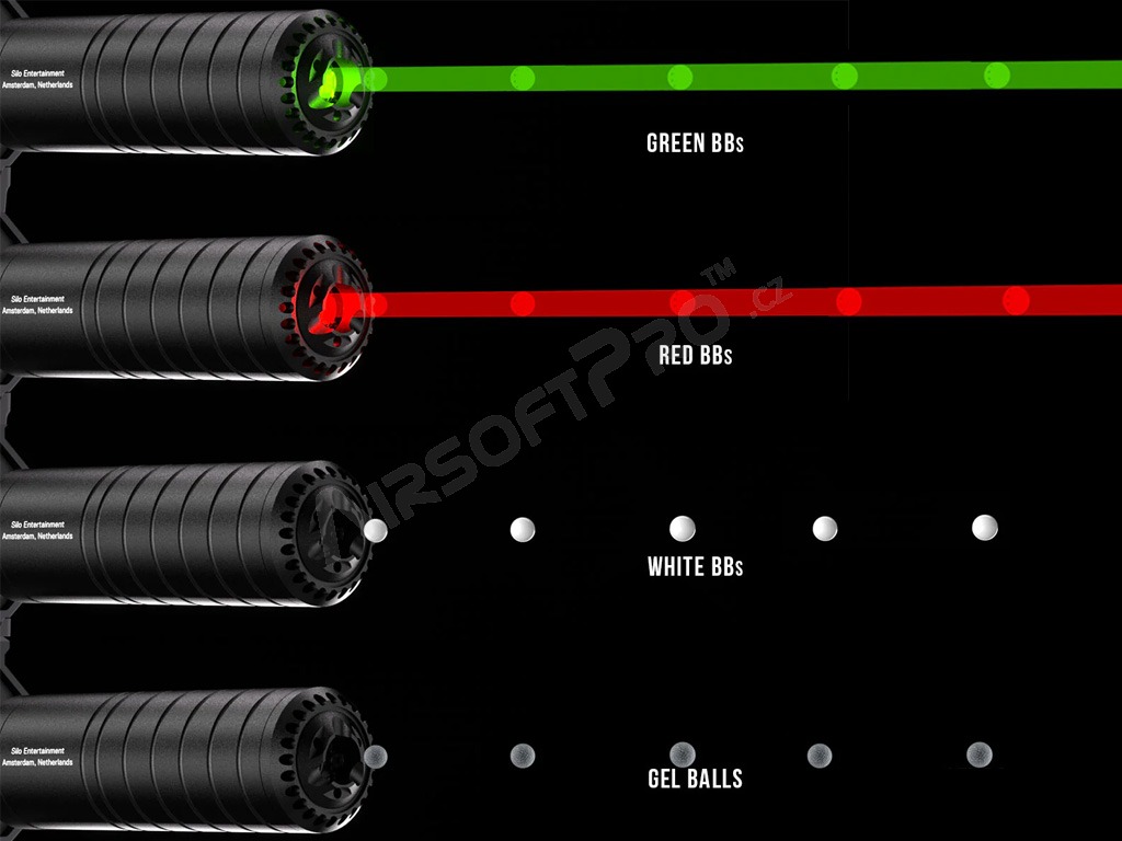 8 modes de lumière et de fumée - y compris stroboscope, traceur, fumée et combinaisons de ces modes Eshooter App - contrôle de l'intensité de la fumée, suivi des statistiques, utilisation du chronographe et plus encore Réponse rapide - supporte 50+ tirs par seconde Construction modulaire et aluminium CNC - longue durée de vie et protection dans des conditions extrêmes Endurance - jusqu'à 3 mois en veille, environ 6 heures de fonctionnement sur une seule charge Recommandé d'utiliser uniquement des huiles Eshooter authentiques pour un fonctionnement en toute sécurité. Les meilleurs résultats sont obtenus avec les billes d'éclairage vertes.