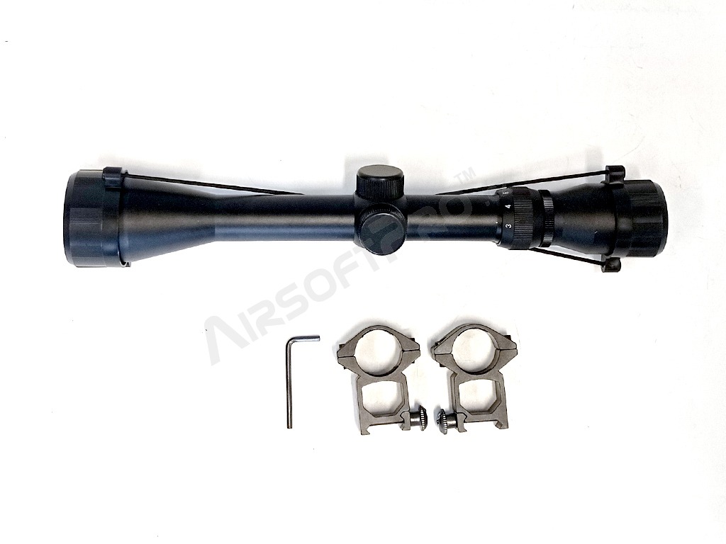 Optique durable entièrement métallique avec un diamètre de 40 mm et un grossissement de 3x à 9x. Bouchons d'objectif inclus. Les anneaux de montage de 25 mm sont inclus. La lunette de visée peut être montée sur n'importe quel rail de montage standard de 22 mm.