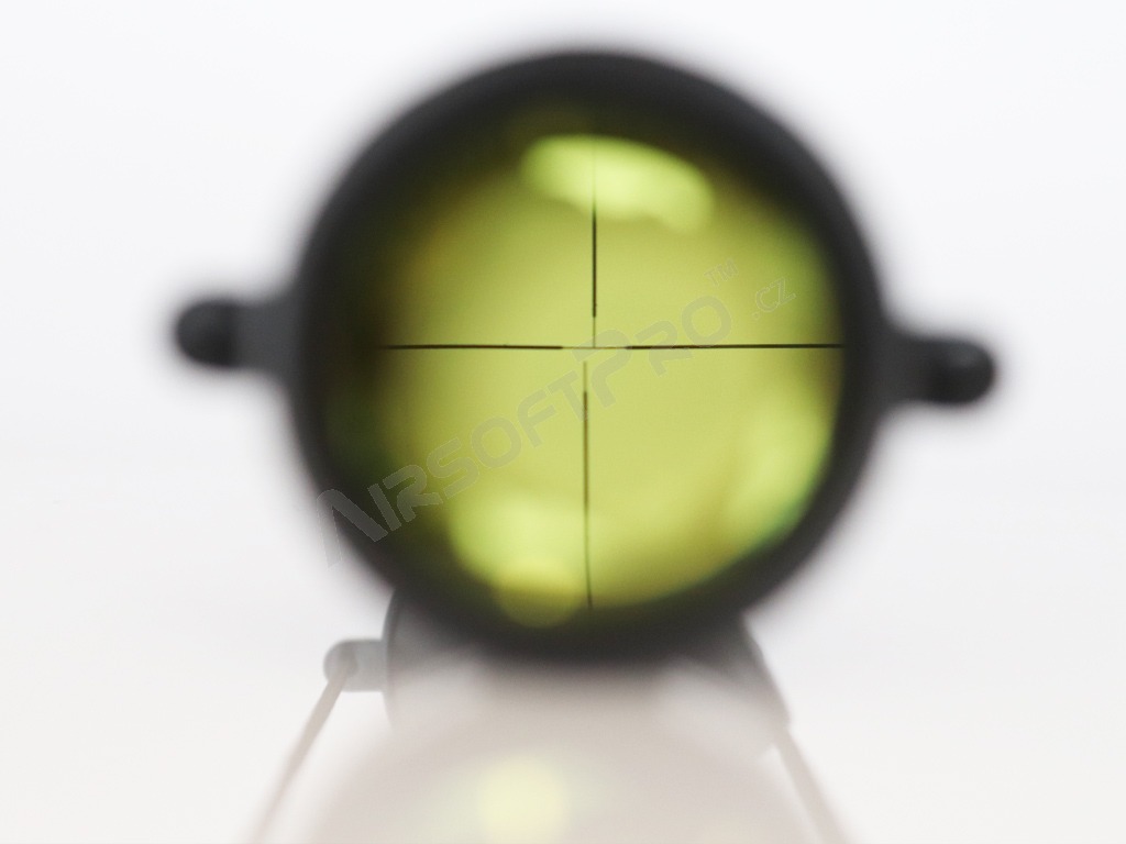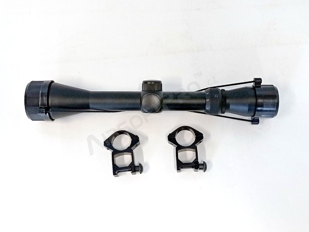 Optique durable entièrement métallique d'un diamètre de 40 mm et d'un grossissement de 3x à 9x. Bouchons d'objectif inclus. Les anneaux de montage de 25 mm sont inclus. La lunette de visée peut être montée sur n'importe quel rail de montage standard de 22 mm.
