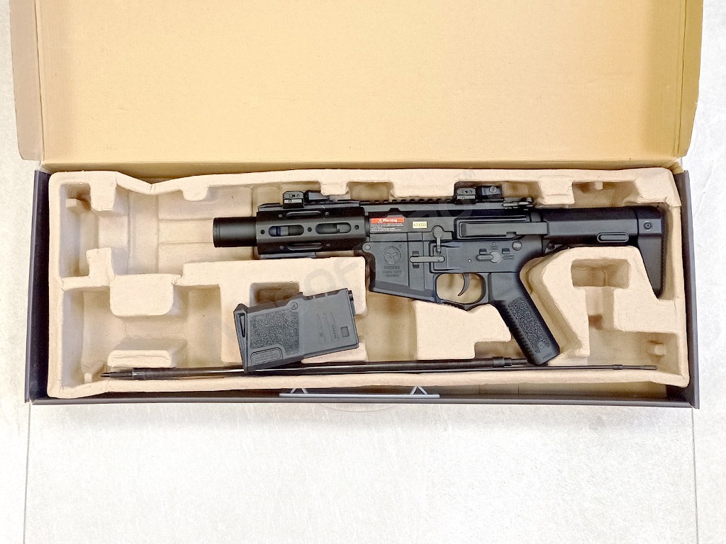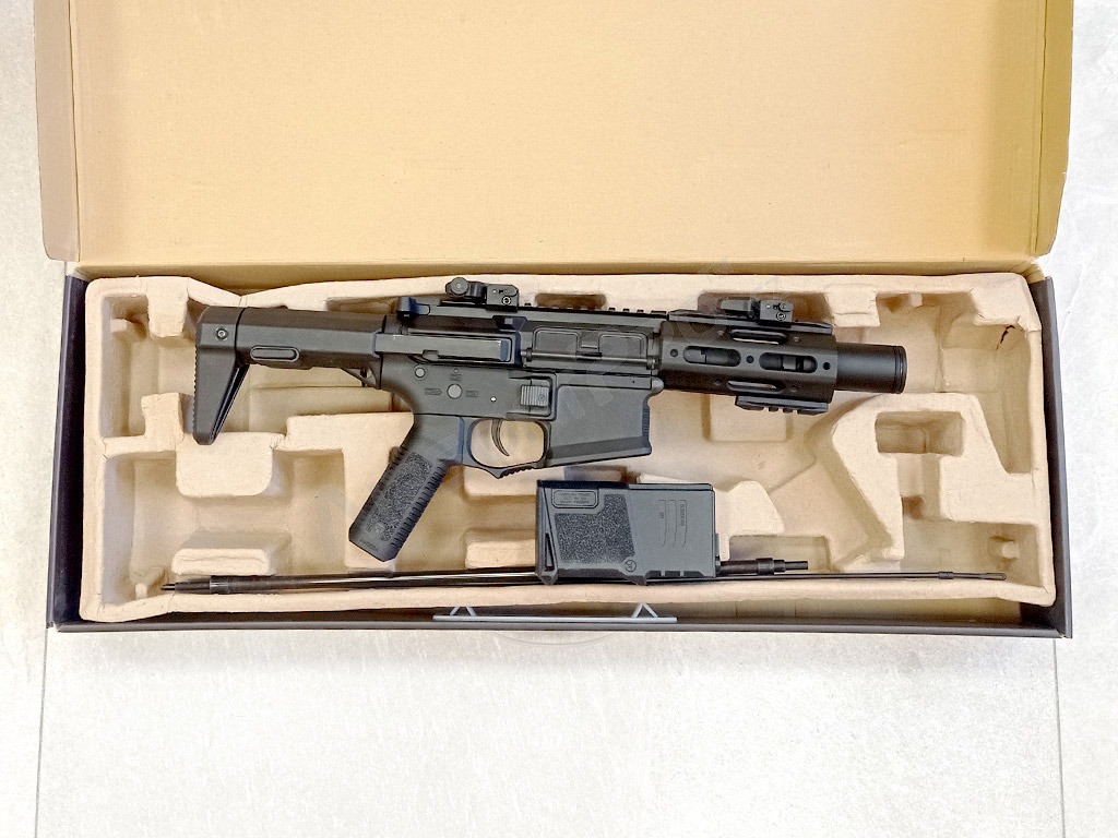 L'arme est équipée d'une crosse rétractable, qui peut accueillir une petite batterie Li-Po 7,4V (tension recommandée jusqu'à 9,6V, des tensions de batterie plus élevées pouvant endommager les pièces internes). Elle est réglable en deux positions pour une meilleure adaptation au tireur. Astuce : Si vous souhaitez augmenter l'espace pour la batterie, nous proposons des extensions en stock - code 7734 et 7735. Le rail RIS sur le bord supérieur de l'arme pour les viseurs ou les optiques est divisé, et il y a un autre rail RIS sur l'extrémité inférieure de l'avant-bras. Il est possible d'ajouter une poignée RIS à l'avant-bras - une poignée compacte de qualité est incluse.