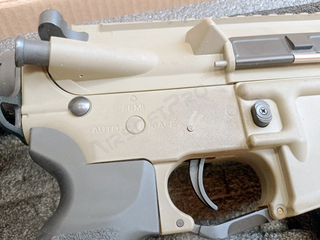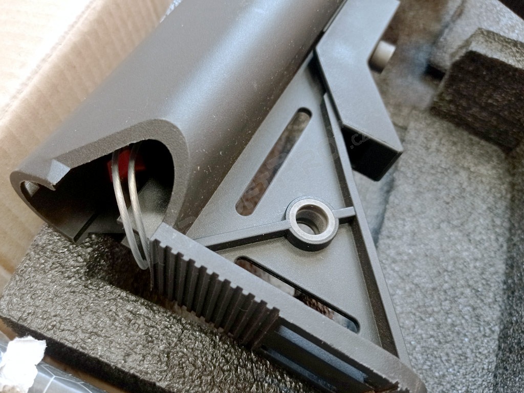 La mechabox et le corps de l'arme sont équipés du système QSC - le changement de ressort est une question de temps. Le système QSC (quick spring change system) permet de retirer le ressort et la tige du ressort de la mechabox sans avoir à démonter la mechabox. Des verrous sont placés sur la tête du mandrin et des trous sont prévus à cet effet dans la boîte à outils. En tournant le mandrin, il est possible de retirer le mandrin et le ressort. Ce pistolet est également équipé du système QSC sur le corps - il n'est pas nécessaire de démonter la boîte à outils du corps - il suffit d'enlever la crosse et de dévisser son tube.
